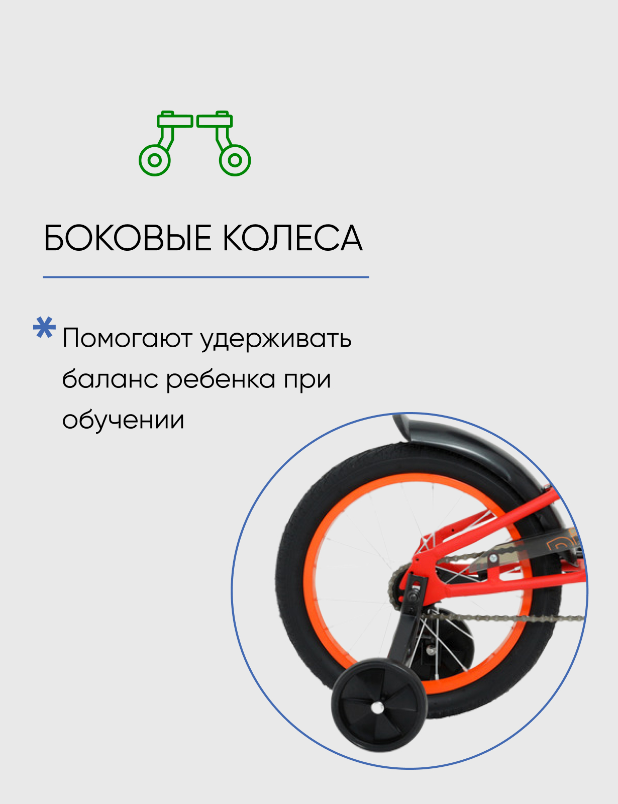 Особенности велосипеда: Алюминиевая рама, Боковые колеса, Защита цепи, Крепления для боковых колес, Крылья, Ножной тормоз, Ручка для родителей.