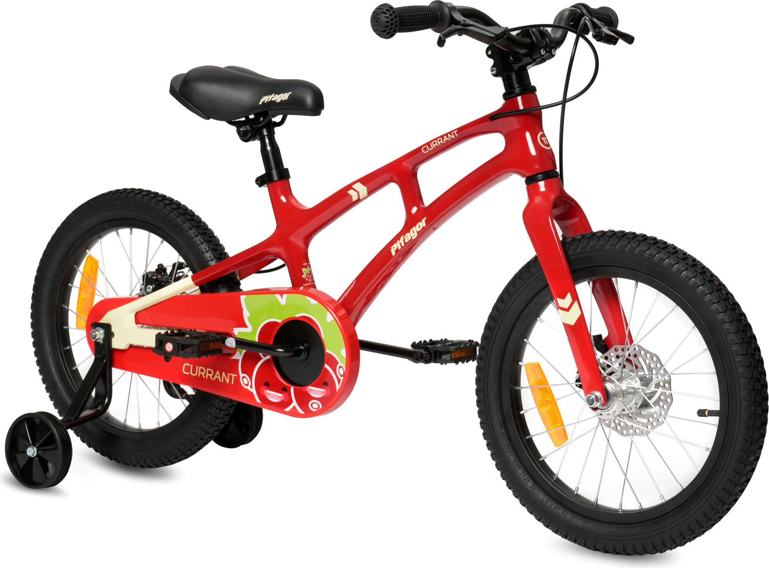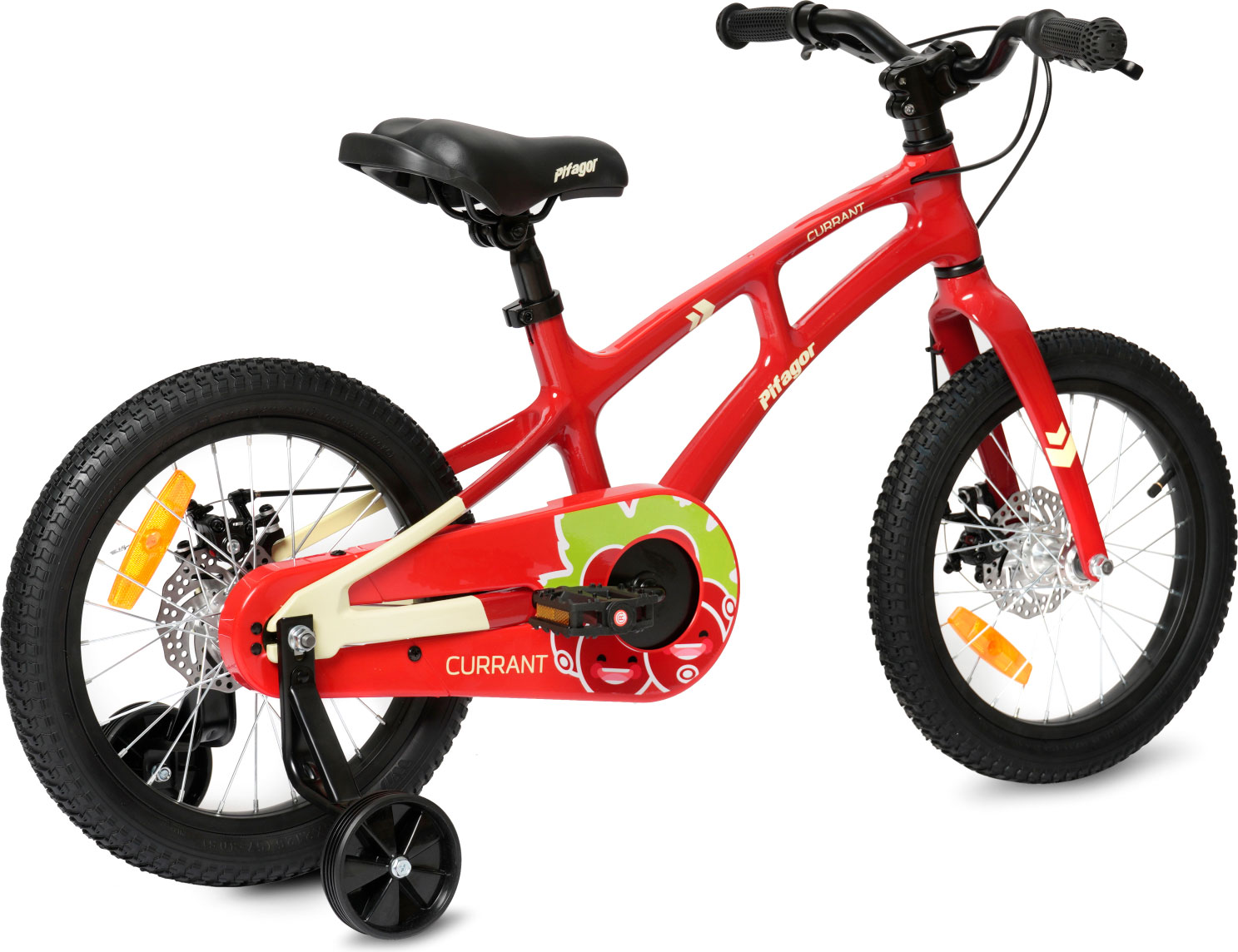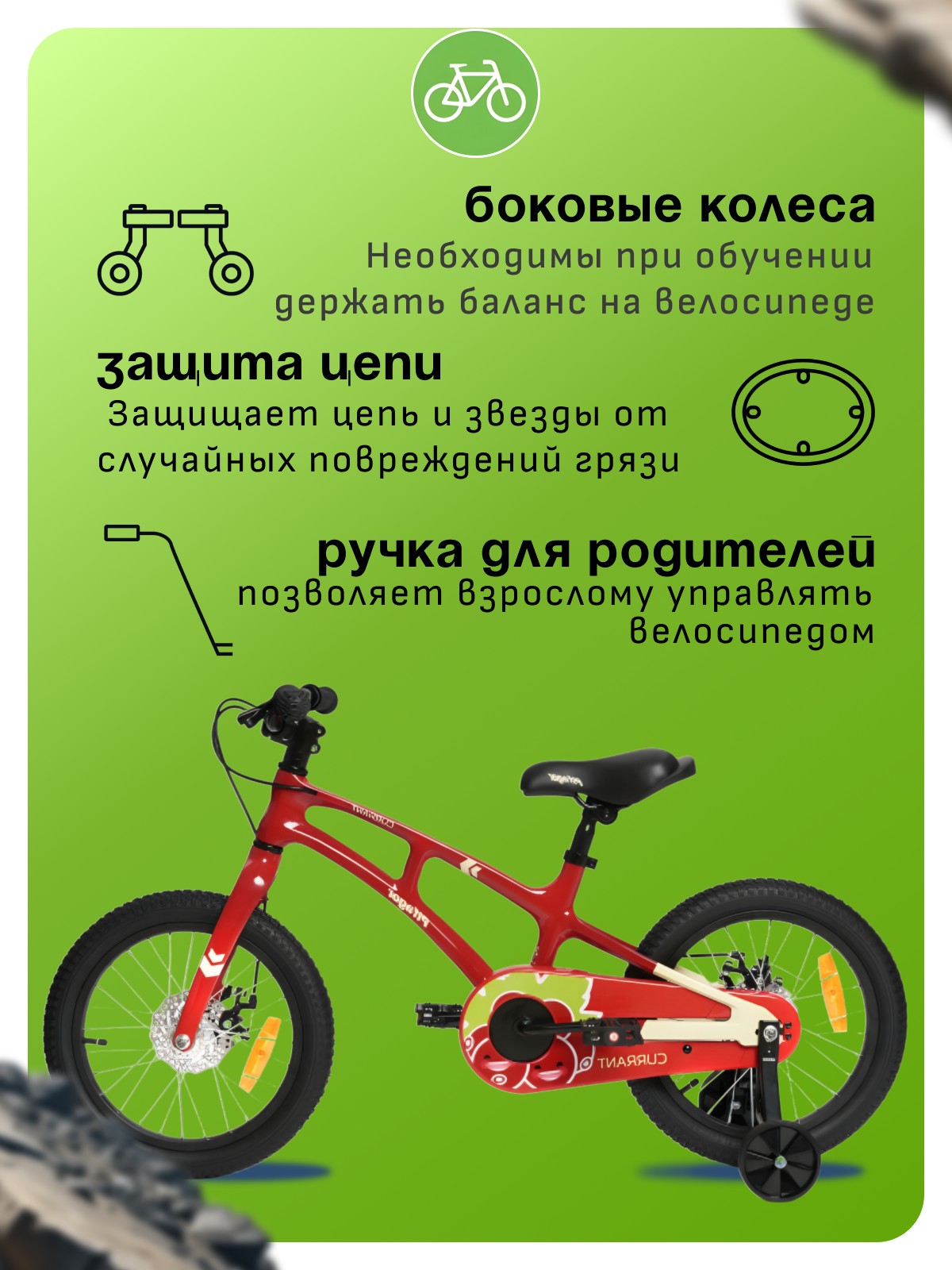 Особенности велосипеда: Боковые колеса, Дисковые тормоза, Защита цепи, Катафоты, Крепления для боковых колес, Ручка для родителей.