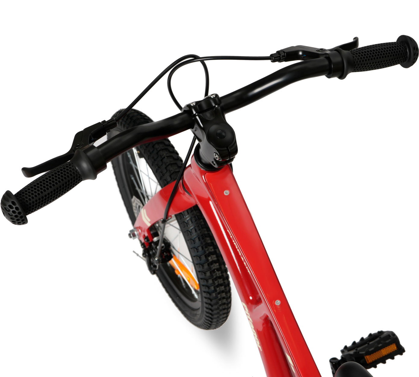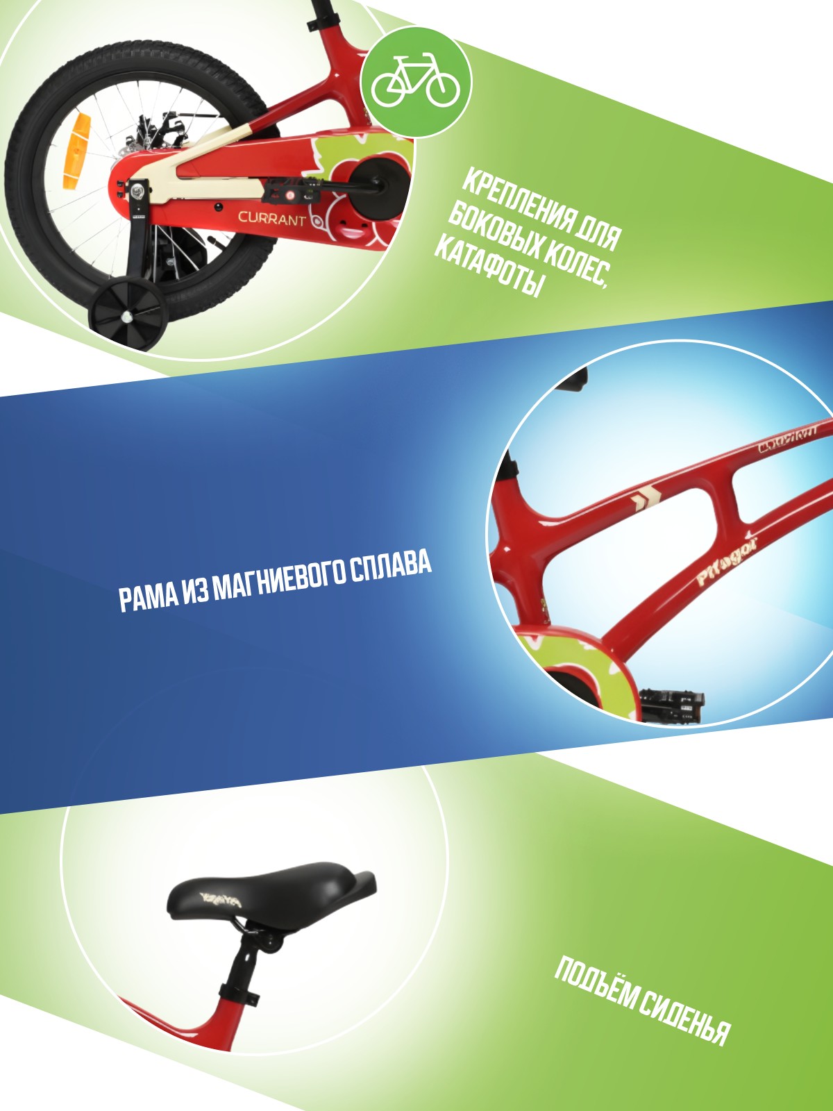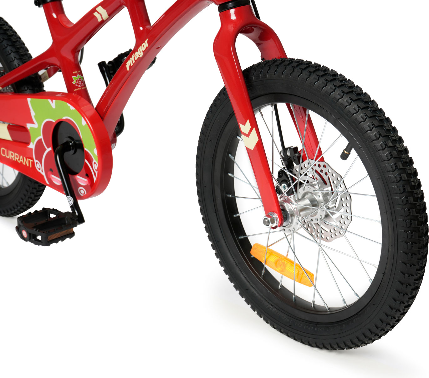 Особенности велосипеда: Боковые колеса, Дисковые тормоза, Защита цепи, Катафоты, Крепления для боковых колес, Ручка для родителей.