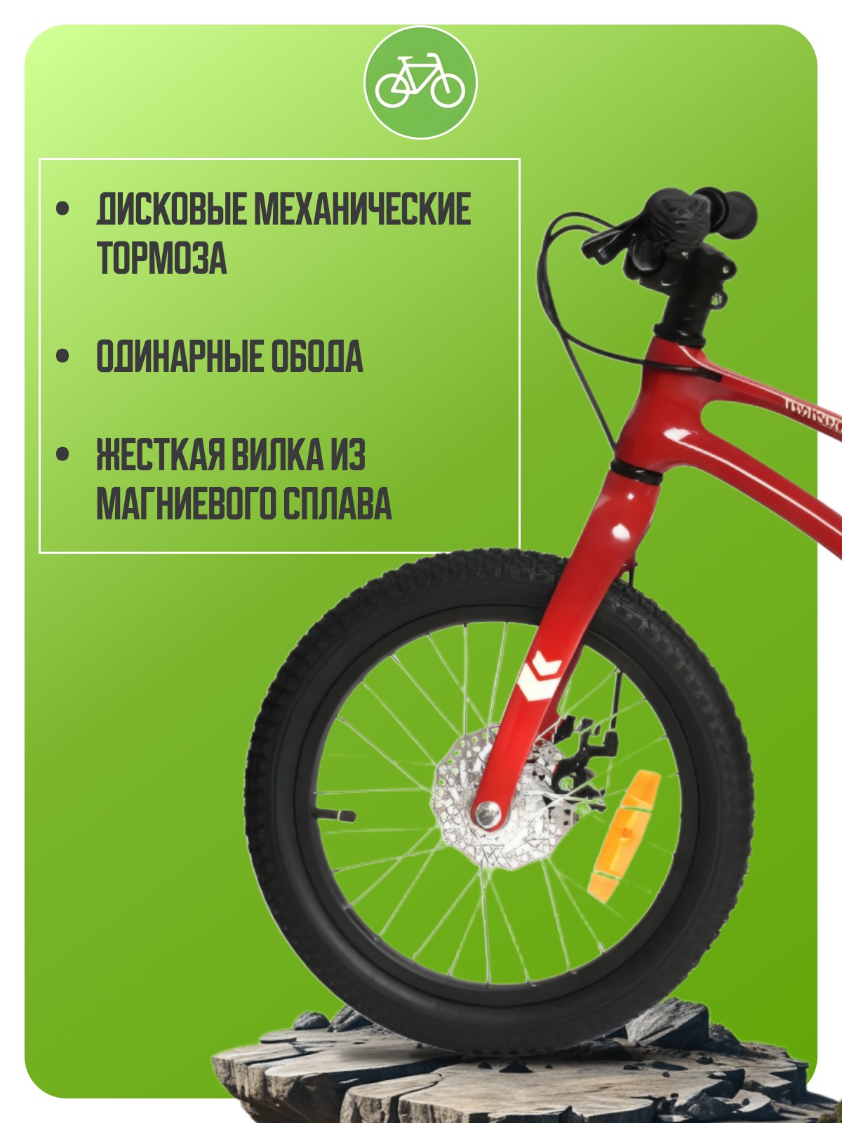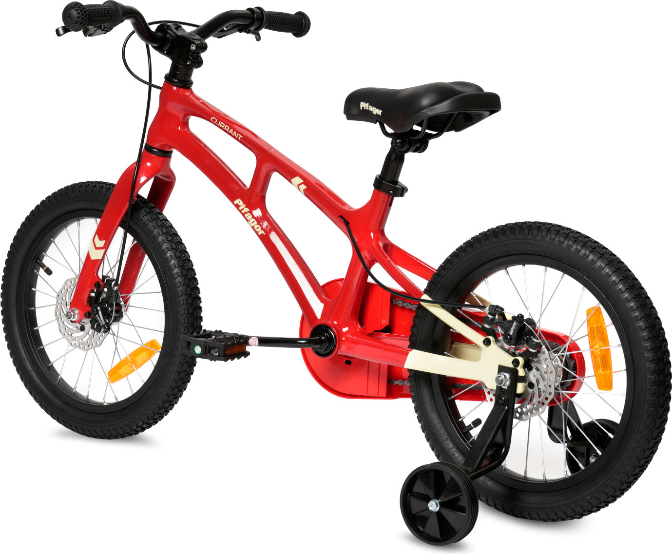 Велосипед, предназначенный для детей в возрасте от трех до шести лет, без переключения передач. Технические особенности: рама из магниевого сплава, жесткая вилка из магниевого сплава, одинарные обода, дисковые механические тормоза, полная защита цепи, дополнительные боковые колеса. Подходит для обучения и прогулочного катания в городских условиях. Диаметр колес - 16 дюймов. Вес - 10,5 кг.
