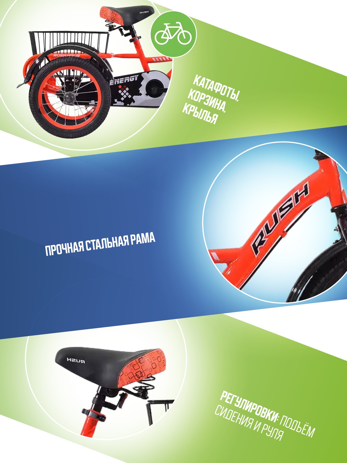 Защита цепи, Звонок, Катафоты, Корзина, Крылья, Трехколесный