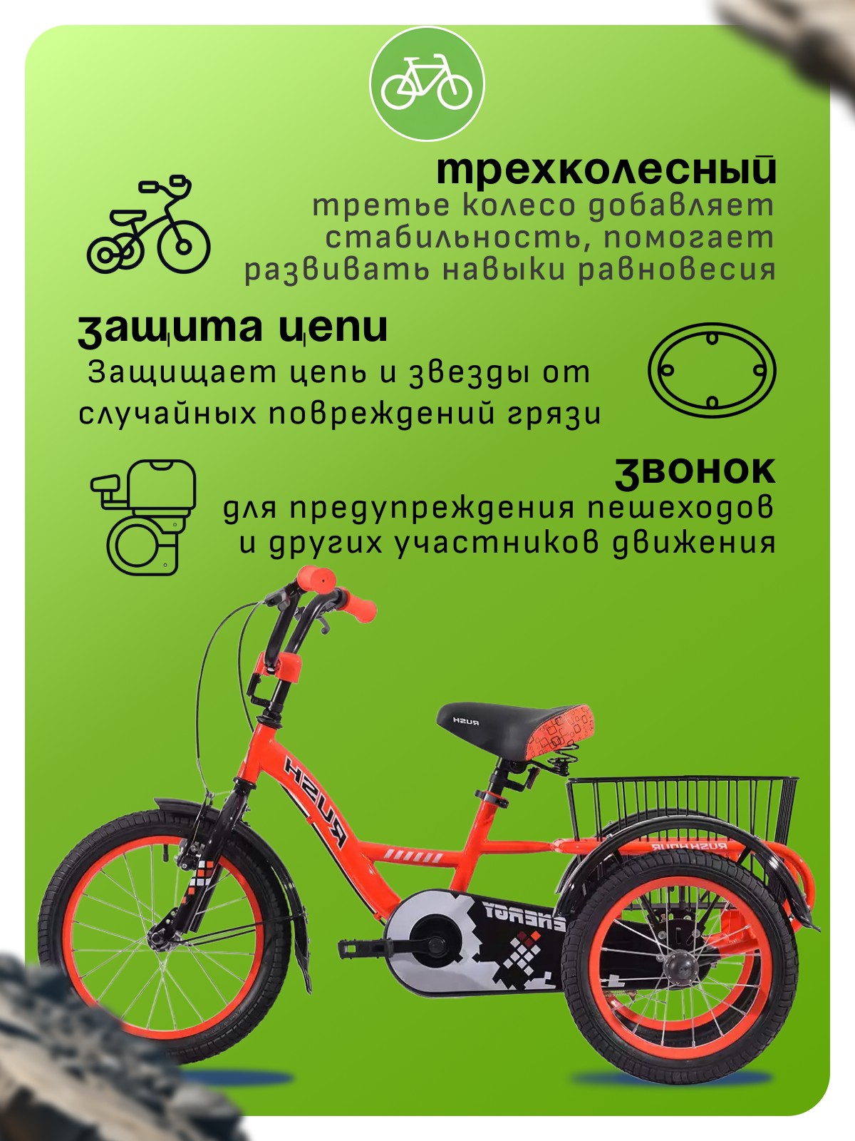 Особенности велосипеда: Защита цепи, Звонок, Катафоты, Корзина, Крылья, Трехколесный.