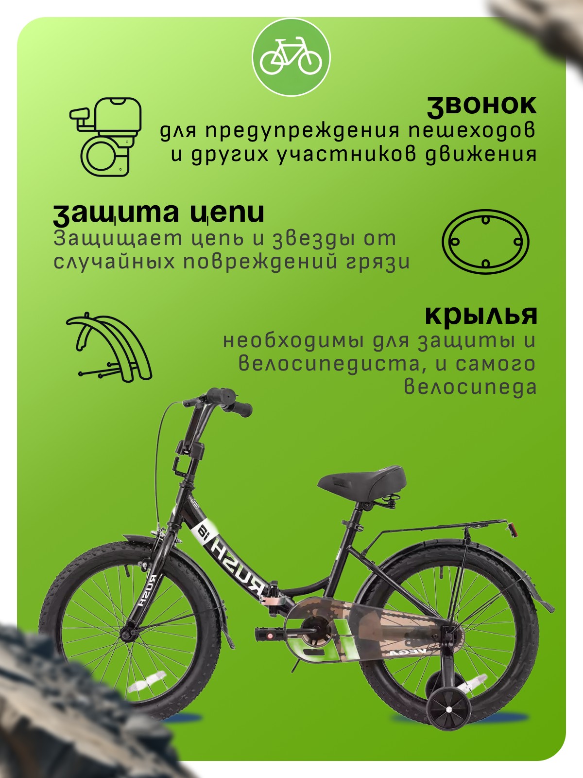 Особенности велосипеда: Багажник, Боковые колеса, Защита цепи, Защитная накладка на руль, Звонок, Катафоты, Крепления для боковых колес, Крылья, Ножной тормоз, Широкое седло.