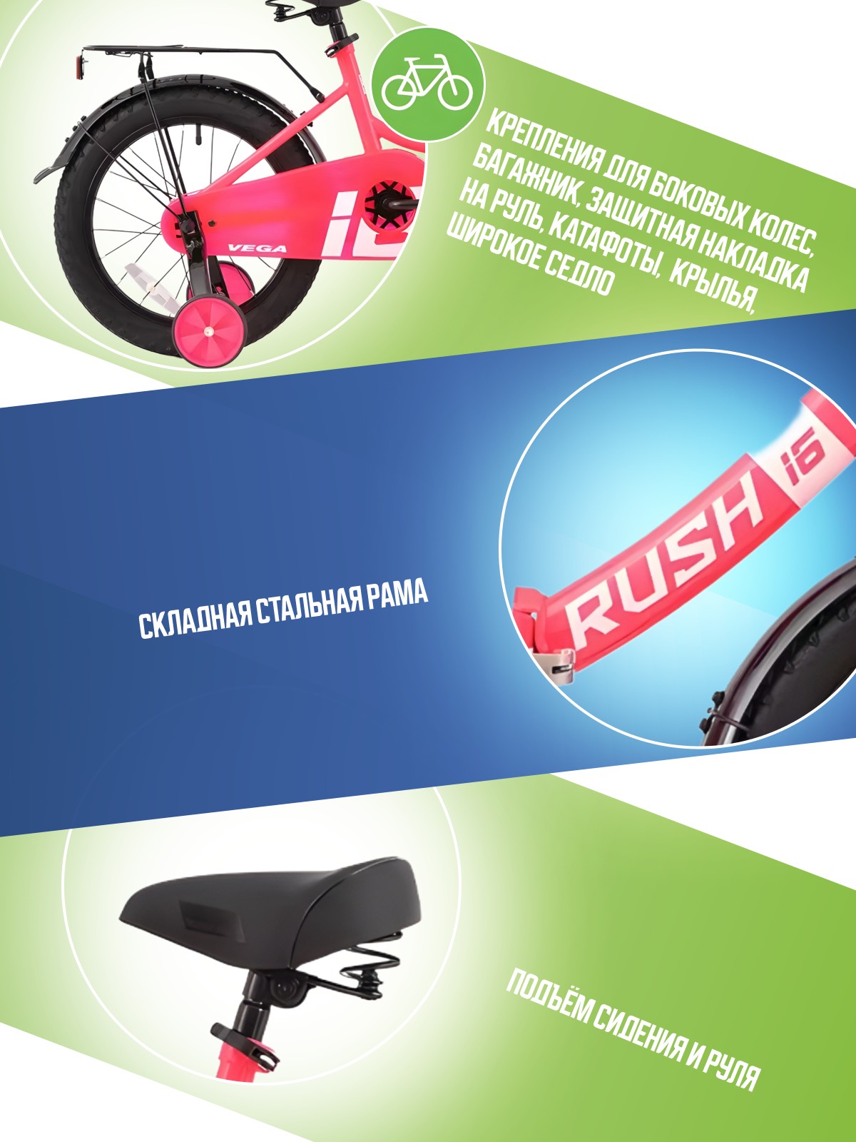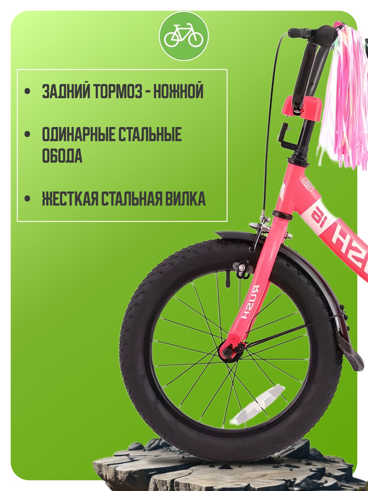 Велосипед, предназначенный для детей в возрасте от трех до шести лет, без переключения передач. Технические особенности: складная стальная рама (сплав Hi-Ten, техноформинг), жесткая стальная вилка (резьбовая, шток 25.4 мм), одинарные стальные обода (под AV ниппель), передний тормоз - ручной клещевой, задний тормоз - ножной, широкое седло с пружинами, полная защита цепи, съемные боковые колеса, длинные крылья с брызговиками, задний багажник, звонок, катафоты. Подходит для обучения и легких прогулок. Диаметр колес - 16 дюймов. Вес - 11,5 кг.