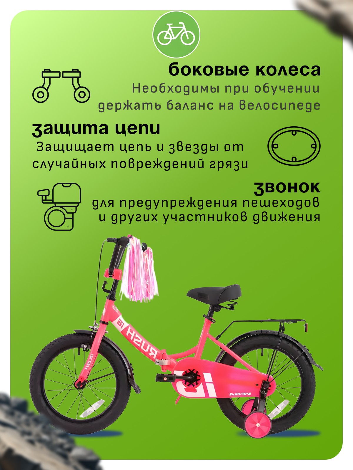 Особенности велосипеда: Багажник, Боковые колеса, Защита цепи, Защитная накладка на руль, Звонок, Катафоты, Крепления для боковых колес, Крылья, Ножной тормоз, Широкое седло.