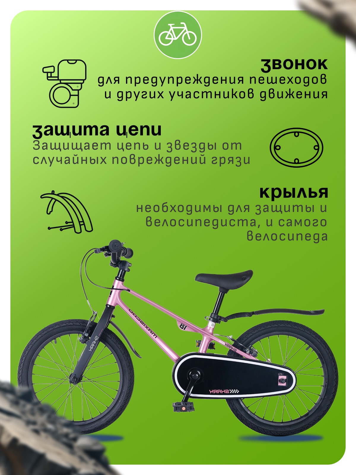 Особенности велосипеда: Защита цепи, Звонок, Крылья.