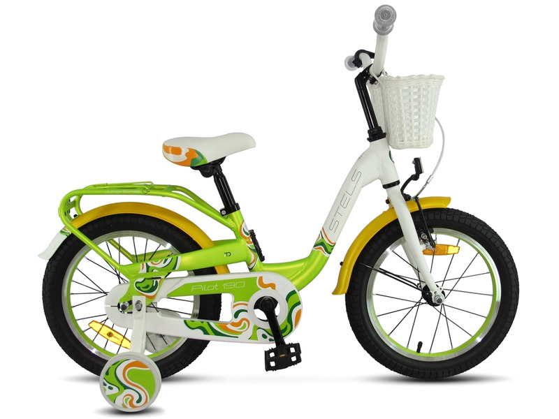 Велосипед, предназначенный для детей в возрасте от трех до шести лет, без переключения передач. Технические особенности: легкая алюминиевая рама (интегрированный багажник, измененная форма дропаута и крепления боковых колес), жесткая стальная вилка, одинарные алюминиевые обода (под AV ниппель), передний тормоз - ручной V-brake (стальные рычаги), задний тормоз - ножной, полная защита цепи, задний багажник, съемные боковые колеса, крылья, защитная накладка на руль, передняя корзинка, звонок, катафоты. Диаметр колес - 16 дюймов. Вес - 10,44 кг.