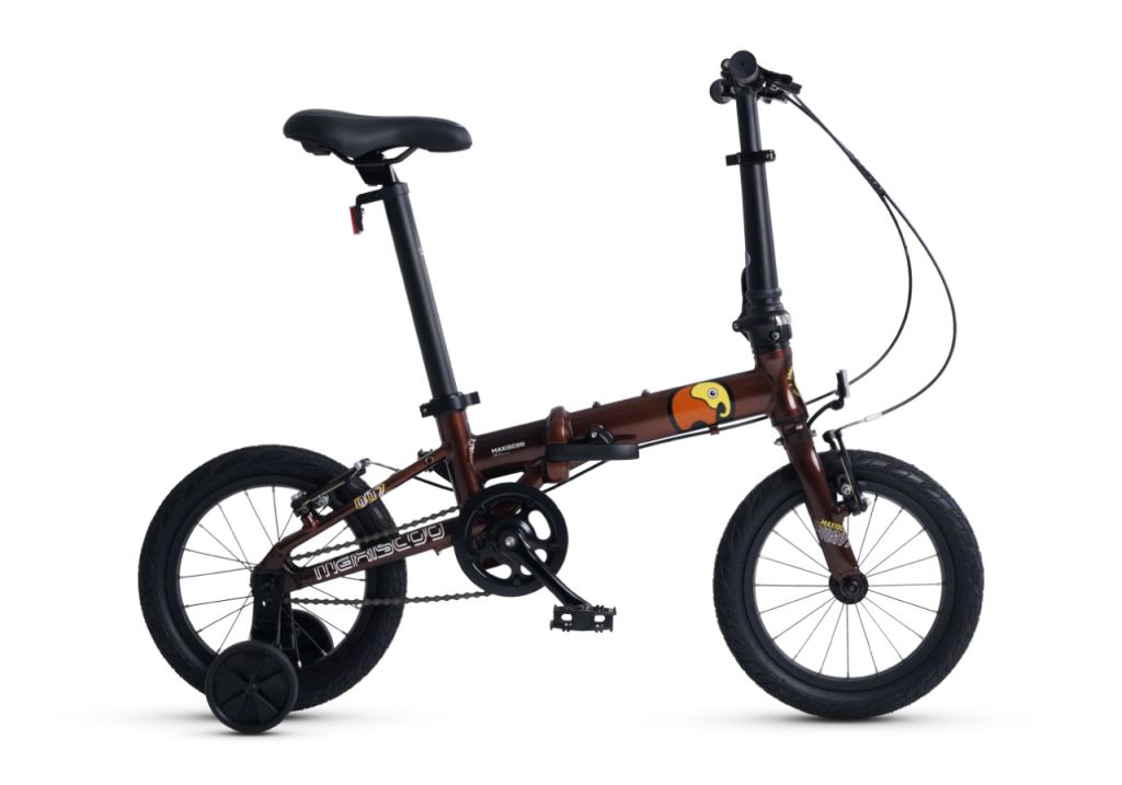 Велосипед, предназначенный для детей в возрасте от двух до четырех лет, без переключения передач. Технические особенности: складная алюминиевая рама (складной механизм, открытая прокладка тросов, бонки под багажник и флягодержатель), жесткая алюминиевая вилка, одинарные алюминиевые обода (под AV ниппель), надежные ободные тормоза типа V-Brake, защита цепи, съемные боковые колеса, катафоты. Подходит для обучения и прогулочного катания в городских условиях. Диаметр колес - 14 дюймов. Вес - 7,9 кг.