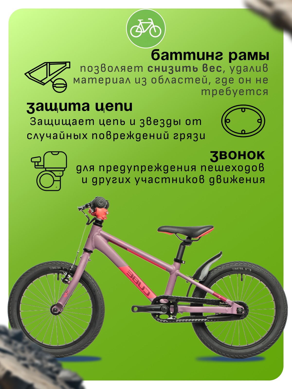 Алюминиевая рама, Баттинг рамы, Защита цепи, Звонок, Крылья, Ножной тормоз