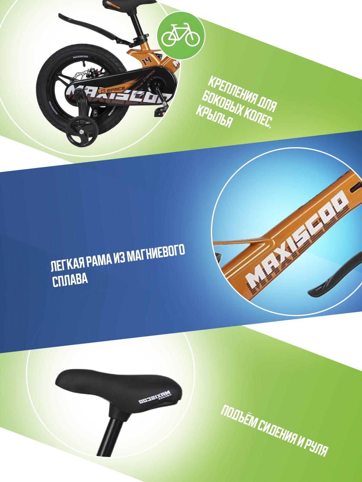 Боковые колеса, Дисковые тормоза, Защита цепи, Звонок, Крепления для боковых колес, Крылья
