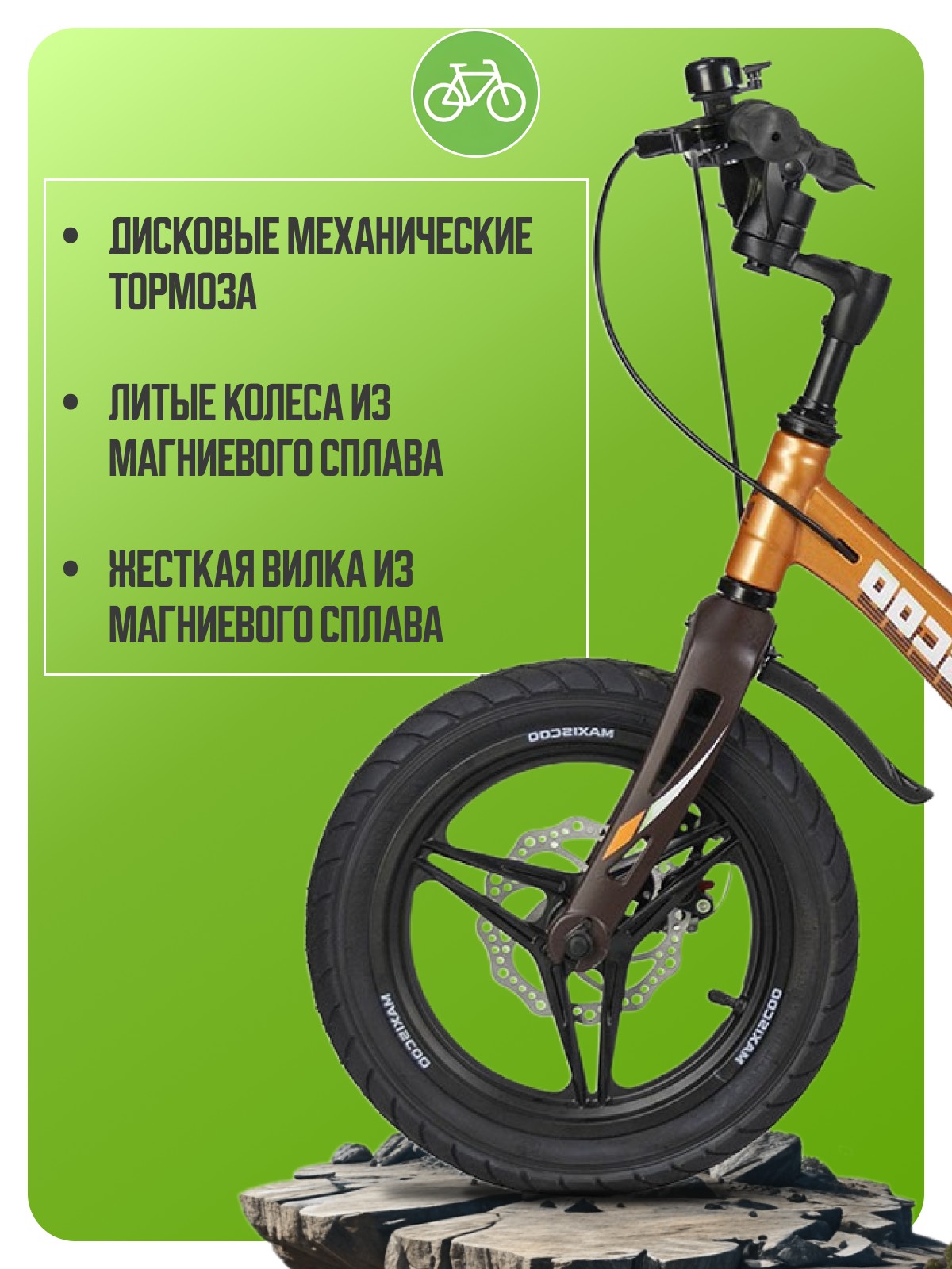 Особенности велосипеда: Боковые колеса, Дисковые тормоза, Защита цепи, Звонок, Крепления для боковых колес, Крылья.