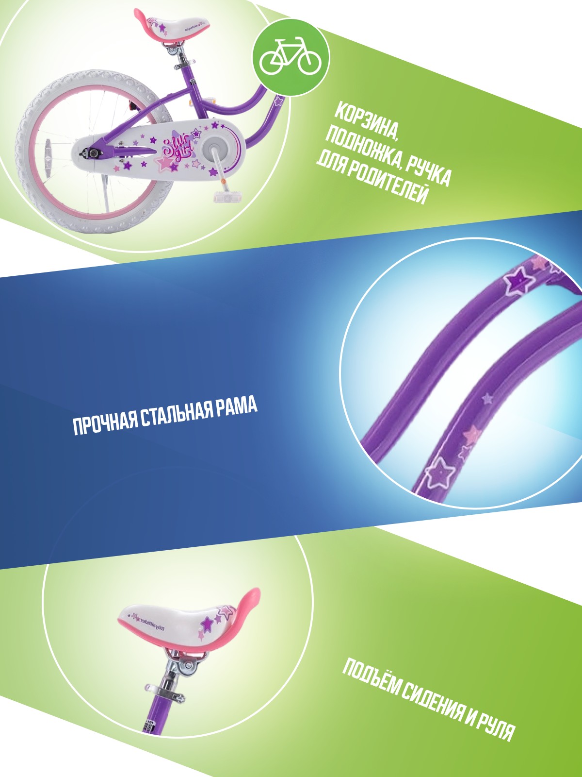 Особенности велосипеда: Защита цепи, Звонок, Катафоты, Корзина, Ножной тормоз, Подножка, Ручка для родителей.