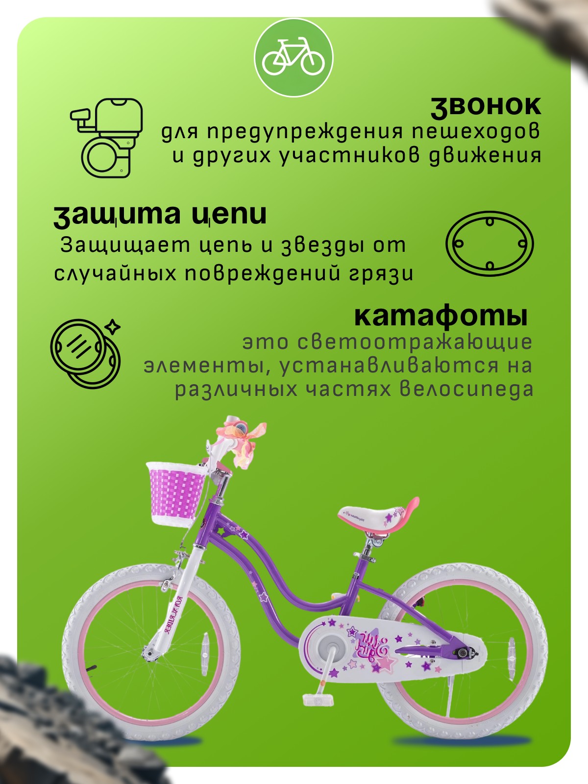 Защита цепи, Звонок, Катафоты, Корзина, Ножной тормоз, Подножка, Ручка для родителей
