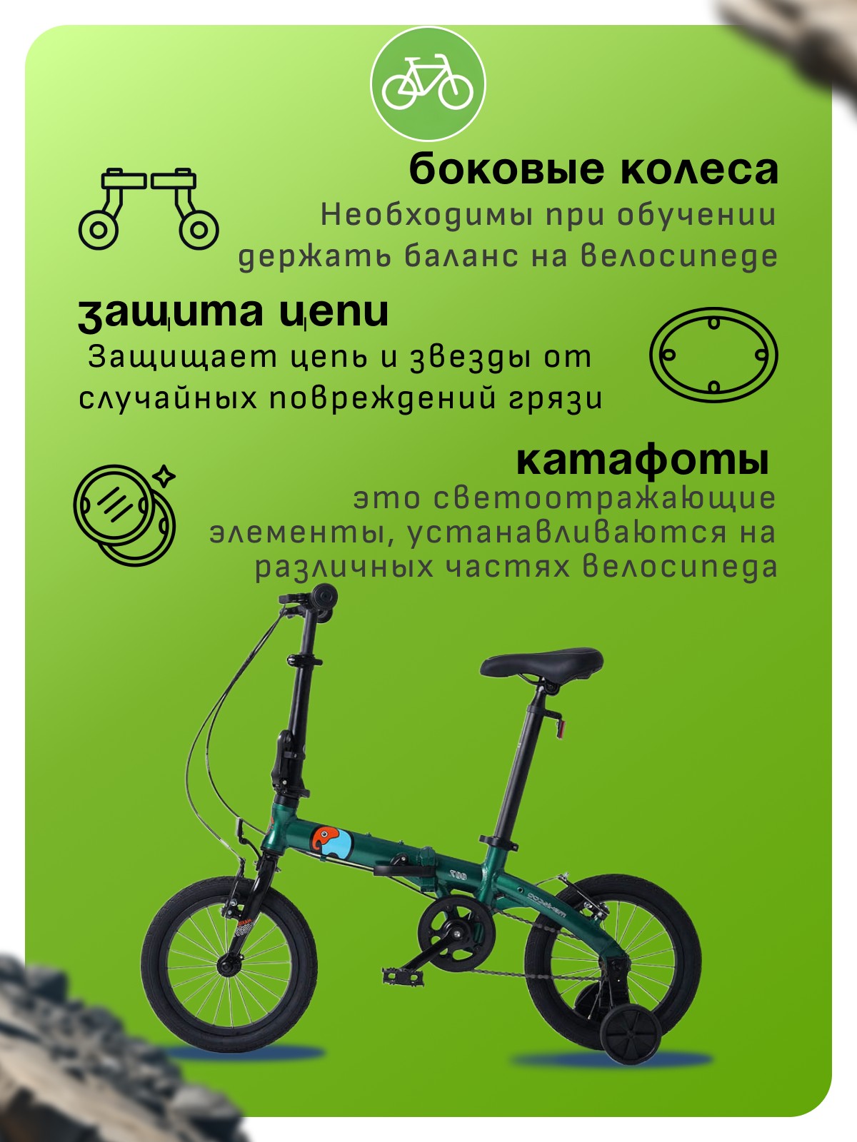Особенности велосипеда: Алюминиевая рама, Боковые колеса, Защита цепи, Катафоты, Крепления для боковых колес.