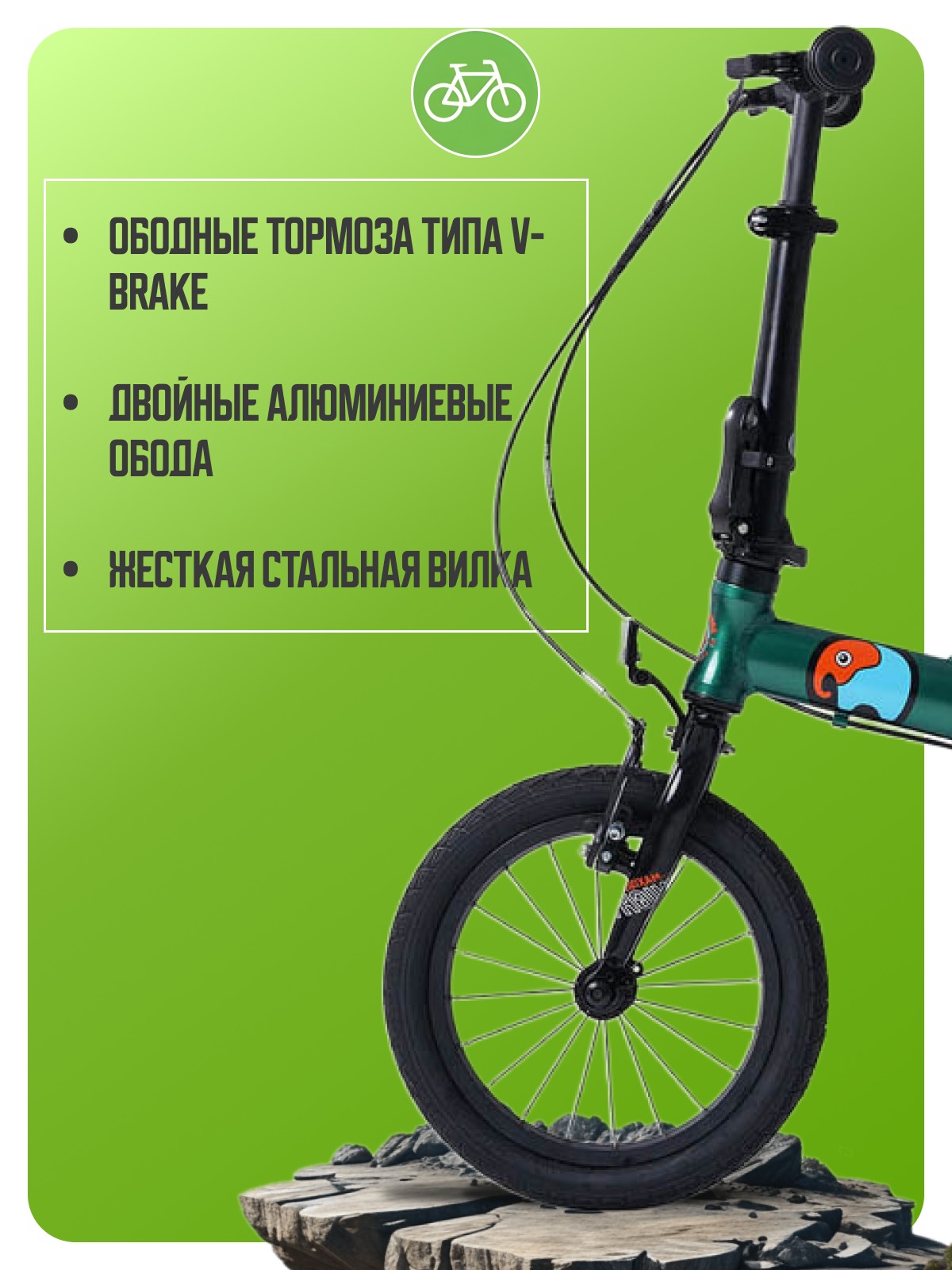 Компактный складной велосипед для детей и взрослых, без переключения передач. Технические особенности: складная алюминиевая рама, жесткая стальная вилка, двойные алюминиевые обода, надежные ободные тормоза типа V-brake, съемные боковые колеса, складная рулевая стойка, катафоты. Подходит для прогулочного катания в городских условиях. Диаметр колес - 14 дюймов. Вес - 9,6 кг.
