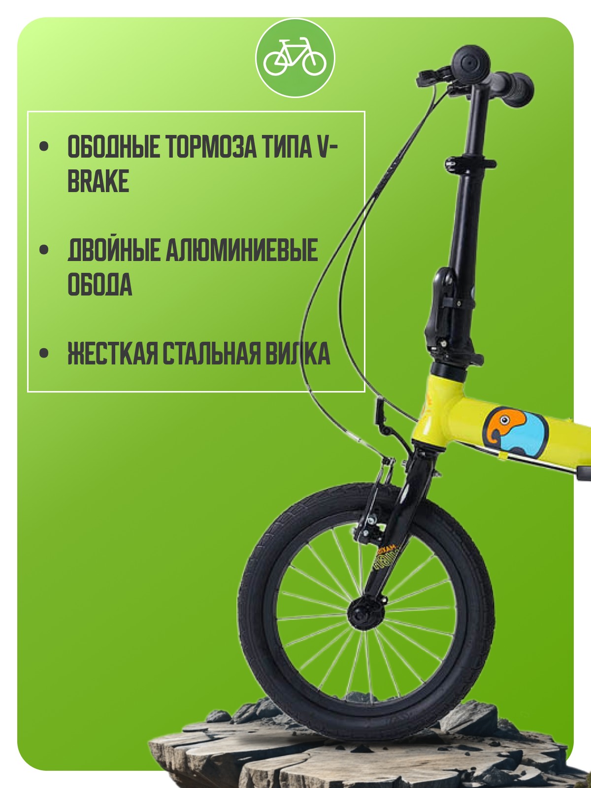 Компактный складной велосипед для детей и взрослых, без переключения передач. Технические особенности: складная алюминиевая рама, жесткая стальная вилка, двойные алюминиевые обода, надежные ободные тормоза типа V-brake, съемные боковые колеса, складная рулевая стойка, катафоты. Подходит для прогулочного катания в городских условиях. Диаметр колес - 14 дюймов. Вес - 9,6 кг.
