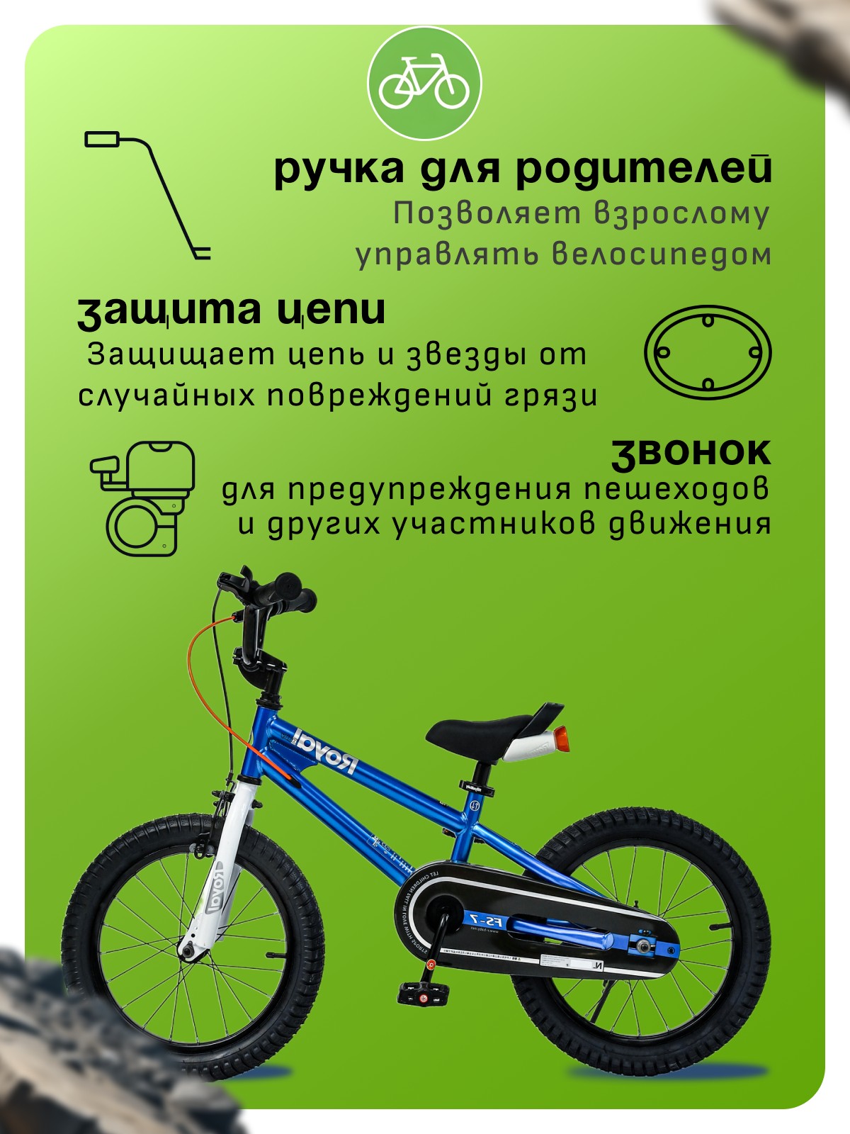 Особенности велосипеда: Защита цепи, Звонок, Катафоты, Крепления для боковых колес, Подножка, Ручка для родителей.