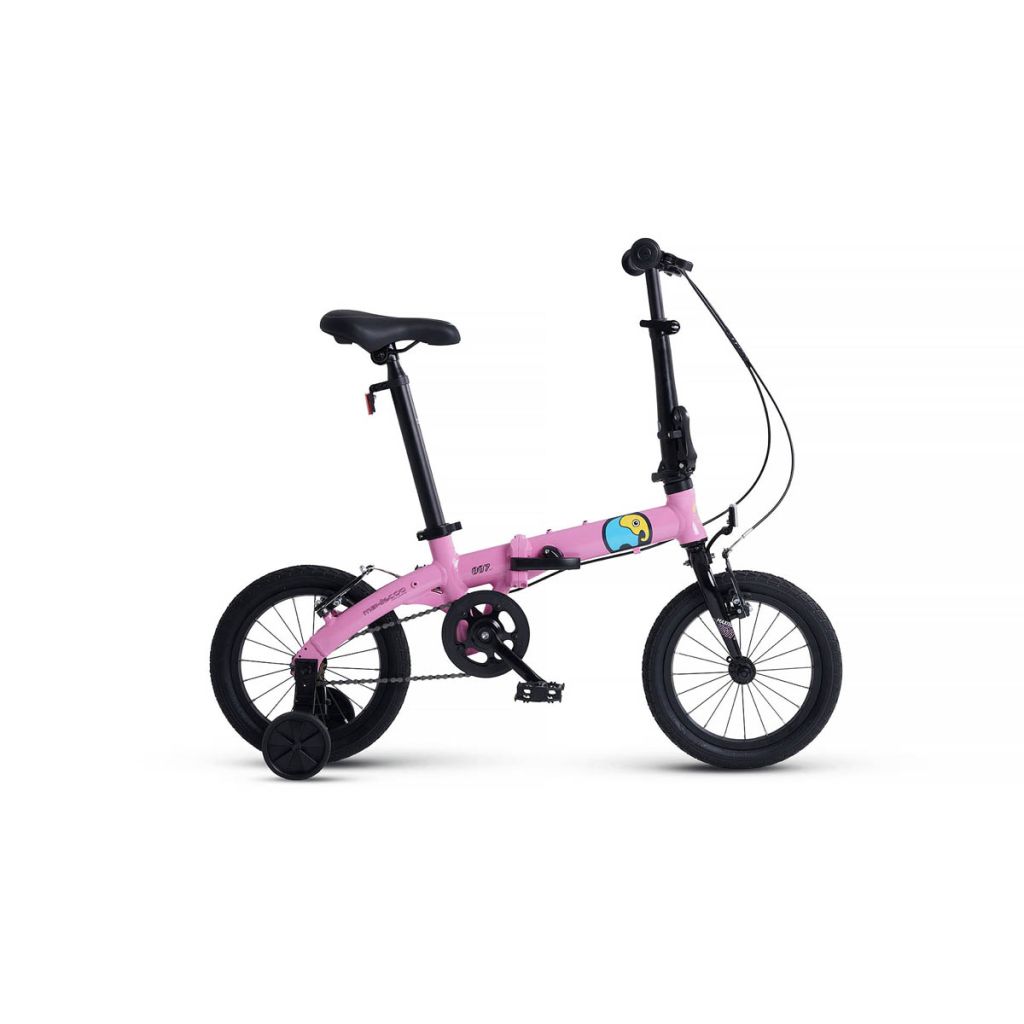 Компактный складной велосипед для детей и взрослых, без переключения передач. Технические особенности: складная алюминиевая рама, жесткая стальная вилка, двойные алюминиевые обода, надежные ободные тормоза типа V-brake, съемные боковые колеса, складная рулевая стойка, катафоты. Подходит для прогулочного катания в городских условиях. Диаметр колес - 14 дюймов. Вес - 9,6 кг.