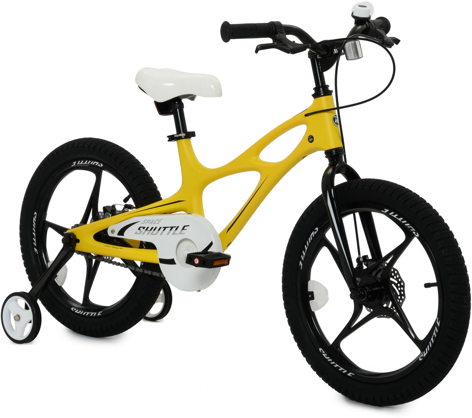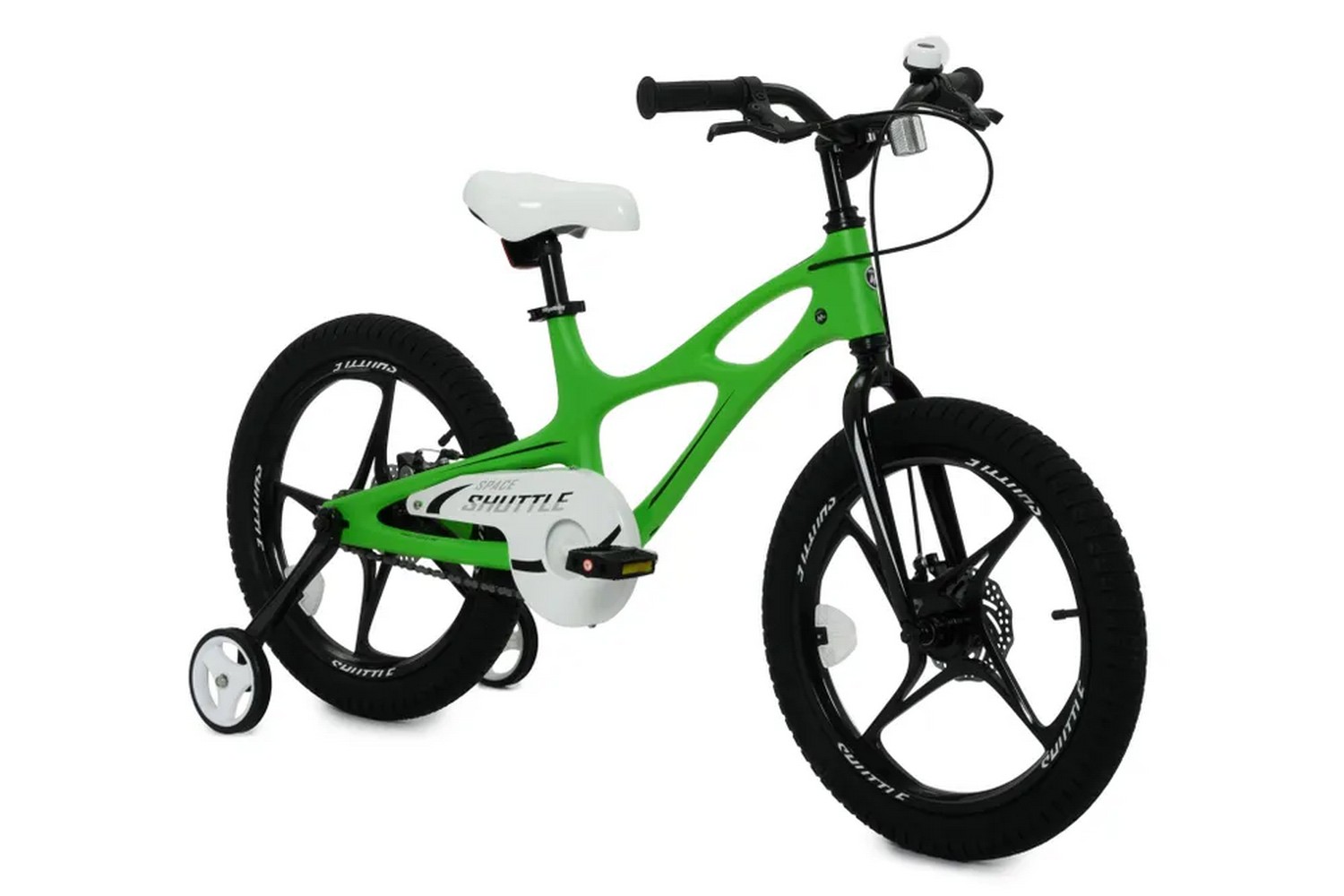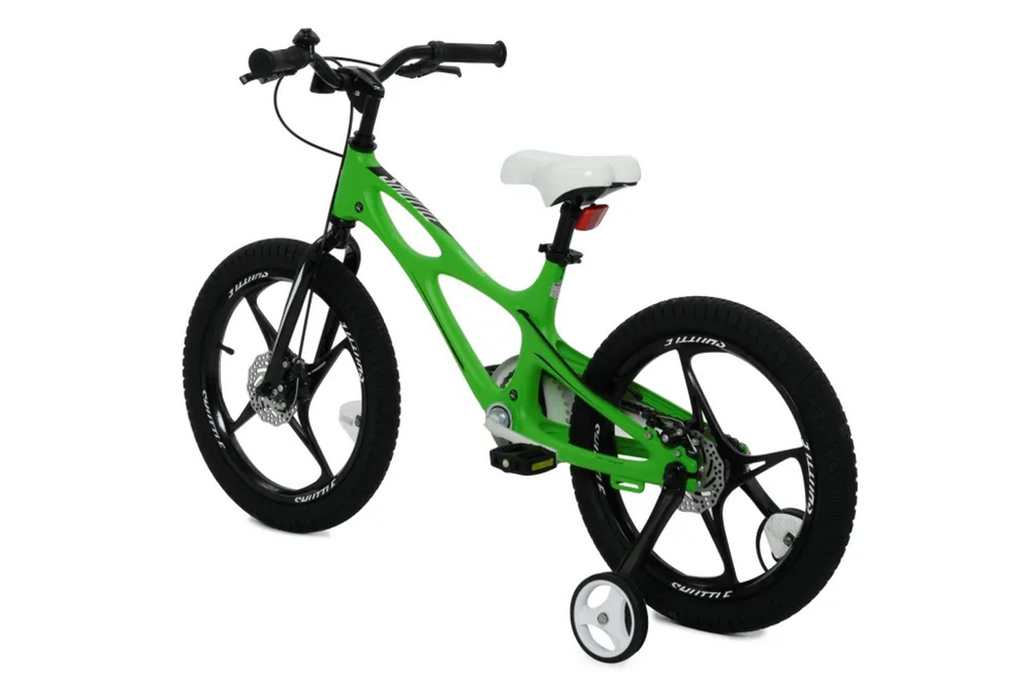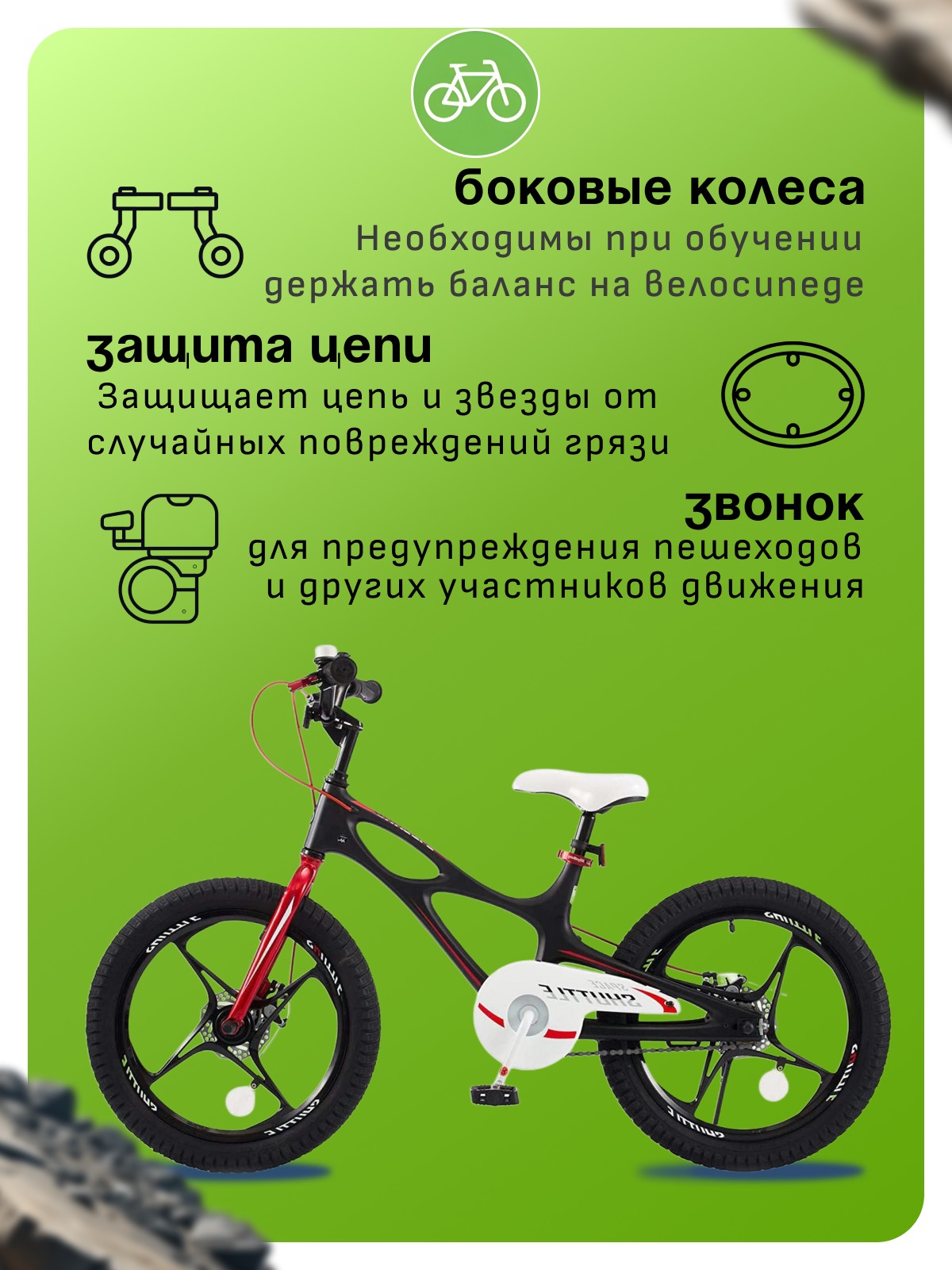 Особенности велосипеда: Боковые колеса, Дисковые тормоза, Защита цепи, Звонок, Катафоты, Крепления для боковых колес, Литые диски.