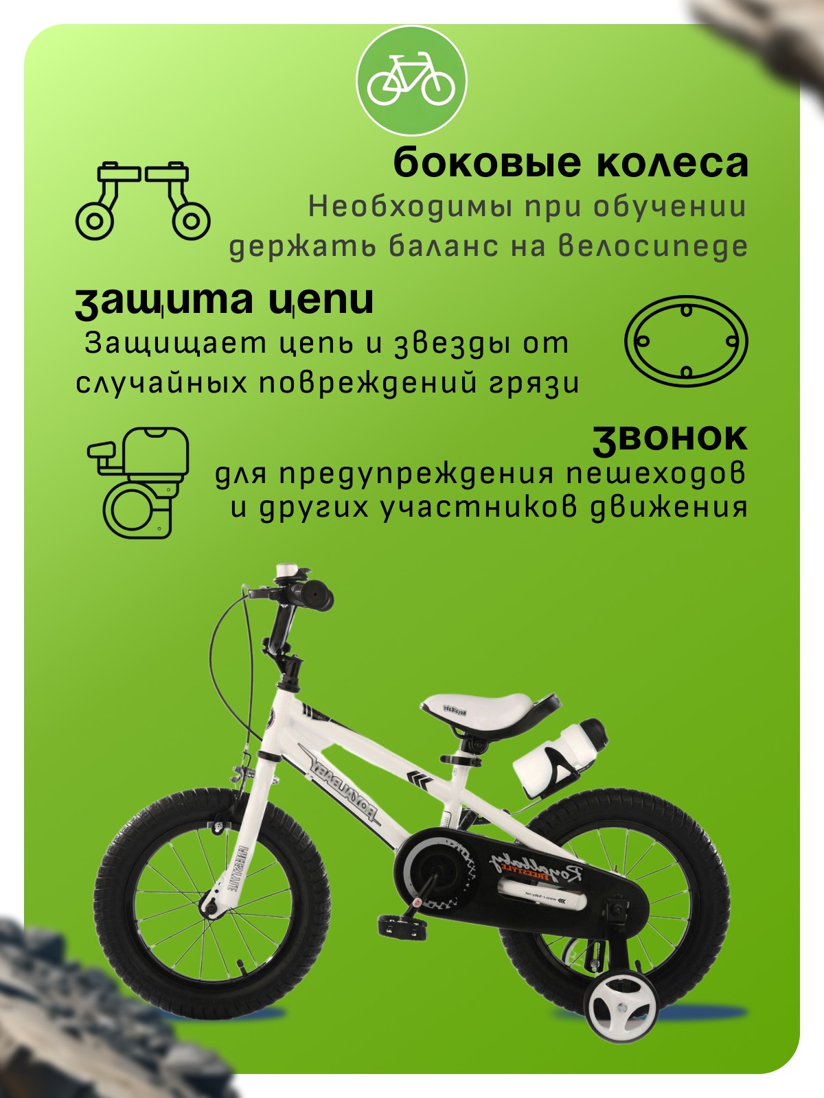 Особенности велосипеда: Боковые колеса, Защита цепи, Звонок, Крепления для боковых колес.