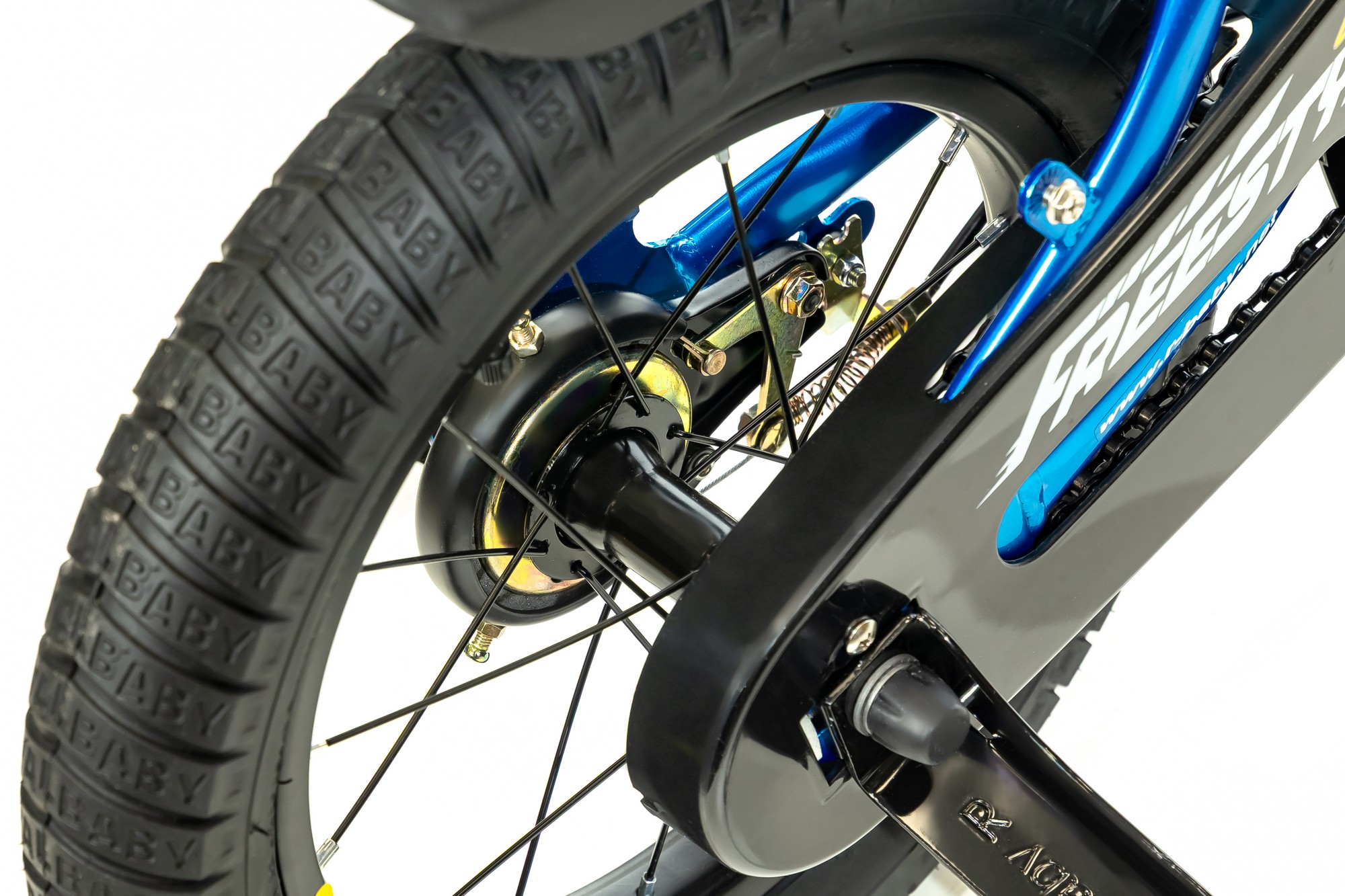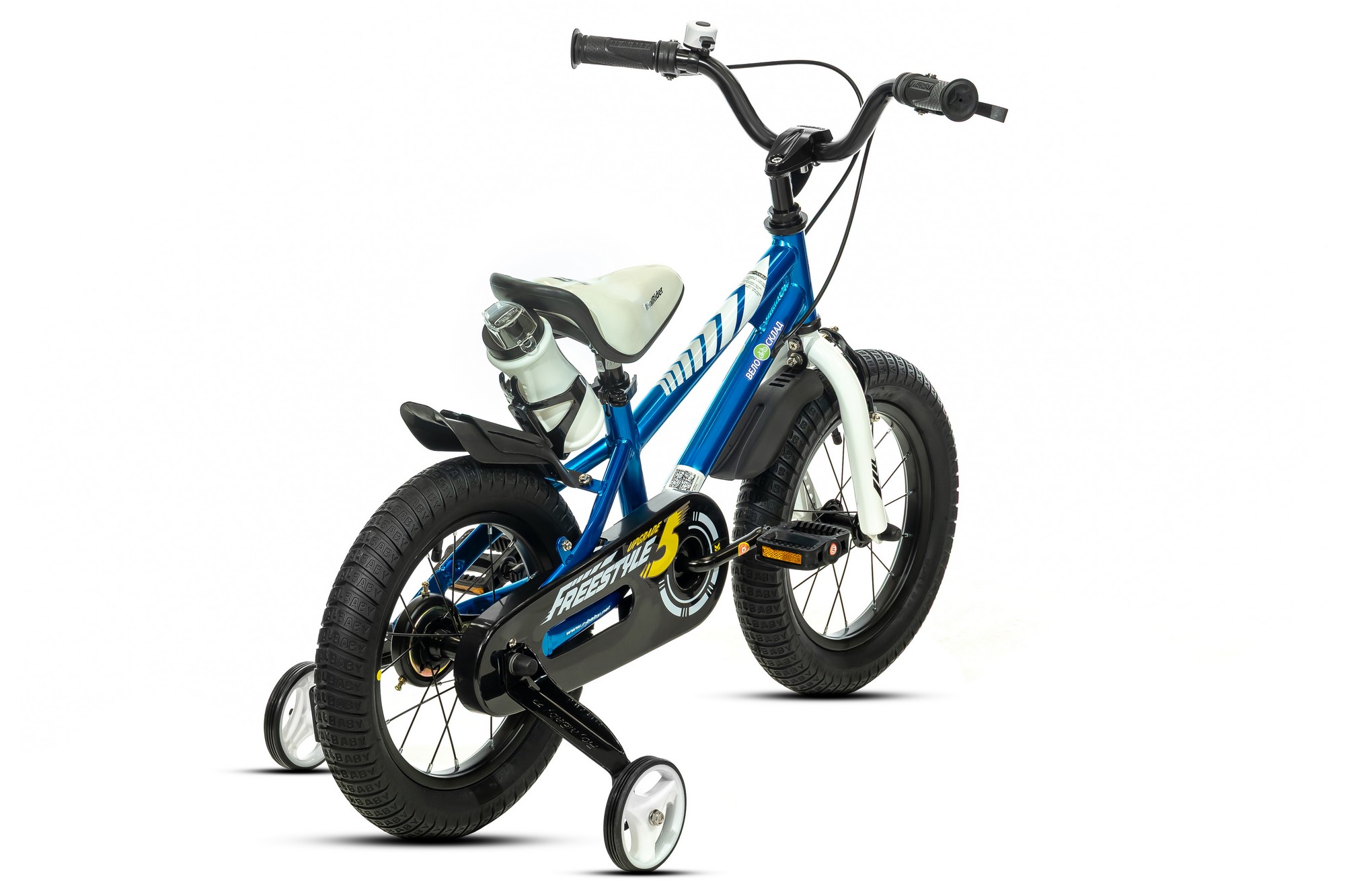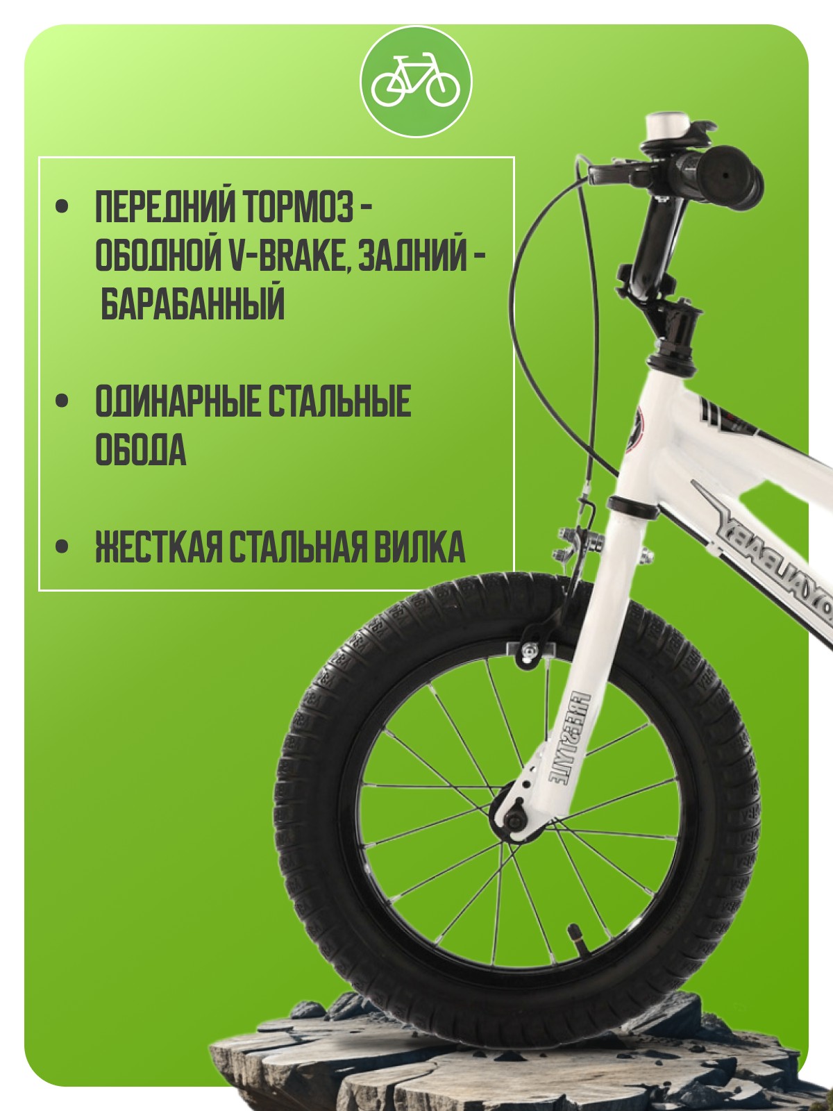 Велосипед, предназначенный для детей в возрасте от трех до пяти лет, без переключения передач. Технические особенности: прочная стальная рама, жесткая стальная вилка, одинарные стальные обода, передний тормоз - ободной V-Brake, задний - барабанный, полная защита цепи, съемные боковые колеса, флягодержатель, звонок. Подходит для обучения и легких прогулок. Диаметр колес - 14 дюймов. Вес - 9 кг.
