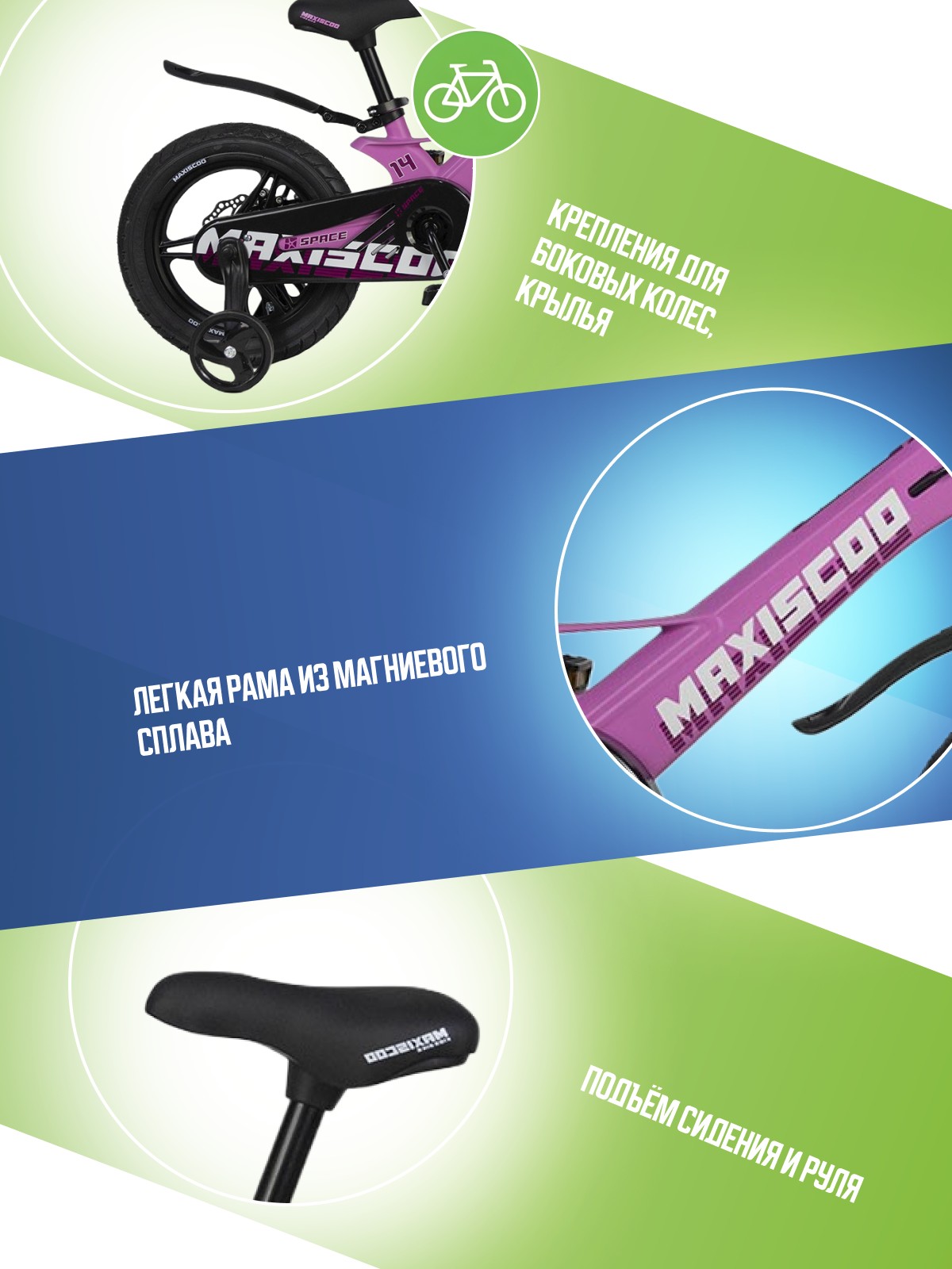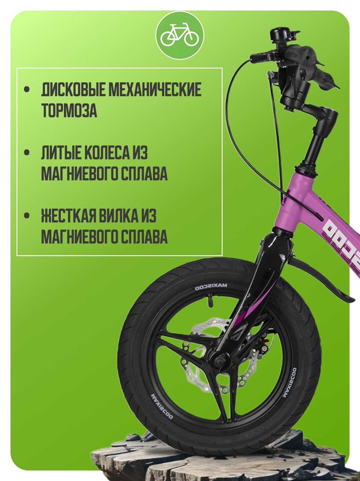 Особенности велосипеда: Боковые колеса, Дисковые тормоза, Защита цепи, Звонок, Крепления для боковых колес, Крылья.