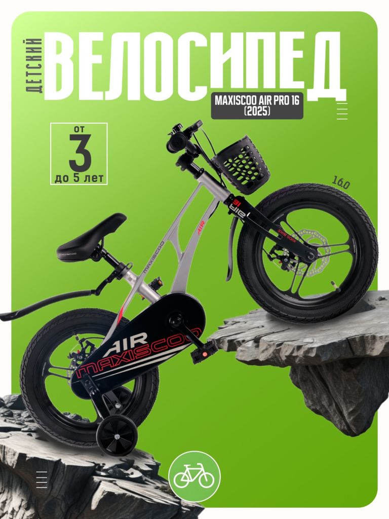 Велосипед, предназначенный для детей в возрасте от трех до шести лет, без переключения передач. Технические особенности: рама из магниевого сплава, жесткая магниевая вилка, литые магниевые колеса, дисковые механические тормоза, пластиковые крылья, съемные боковые колеса, звонок, полная защита цепи, корзина. Подходит для обучения и прогулочного катания в городских условиях. Диаметр колес - 16 дюймов. Вес - 9,4 кг.
