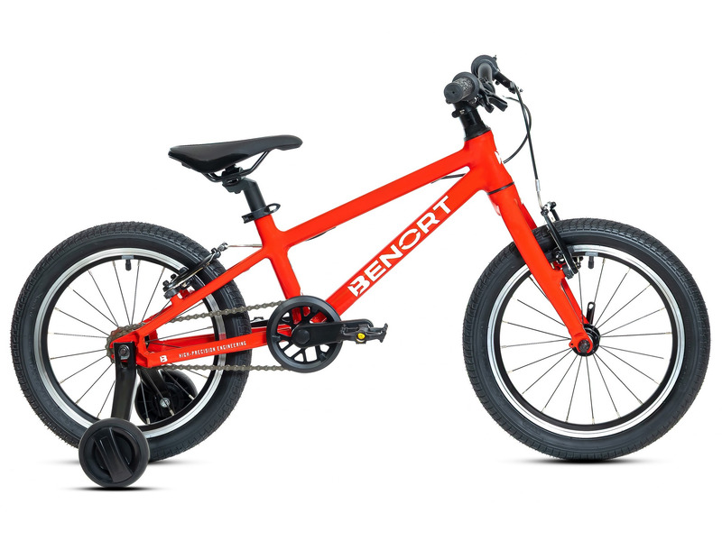 Велосипед, предназначенный для детей в возрасте от четырех до семи лет, без переключения передач. Технические особенности: легкая алюминиевая рама (сплав 6061, частично скрытая проводка, компенсация швов, кареточный стакан BSA, прямой рулевой стакан), жесткая алюминиевая вилка (сплав 6061, компенсация швов), двойные алюминиевые обода (под ниппель AV), надежные ободные тормоза V-brake (алюминиевые рычаги), защита цепи, съемные боковые колеса. Подходит для обучения и прогулочного катания в городских условиях. Диаметр колес - 16 дюймов. Вес - 7,7 кг.
