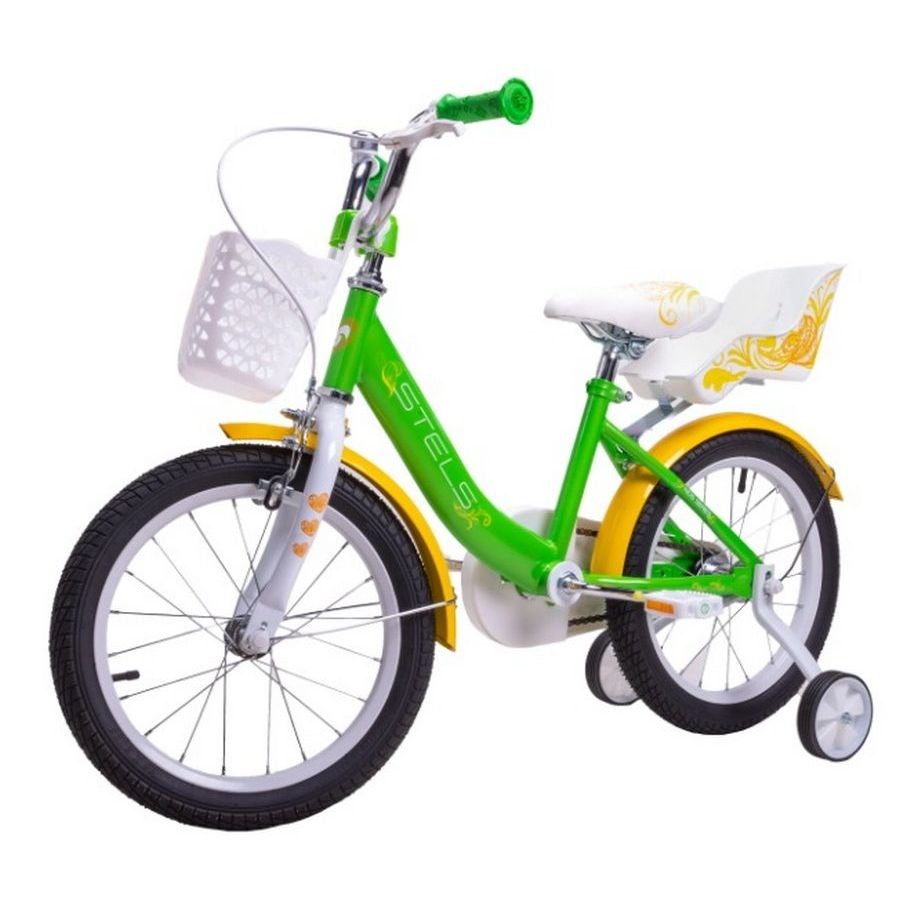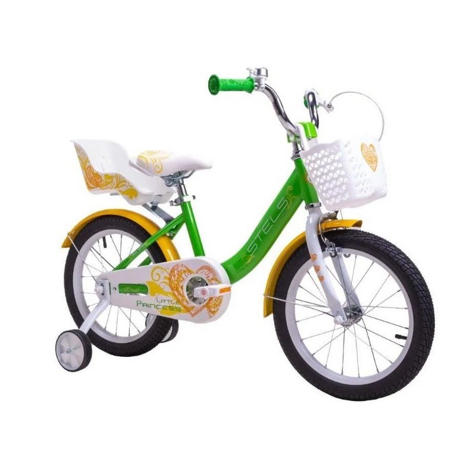 Велосипед, предназначенный для девочек в возрасте от двух до четырех лет, без переключения передач. Технические особенности: прочная стальная рама, жесткая стальная вилка, одинарные стальные обода (под AV ниппель), передний тормоз - ободной клещевой, задний тормоз - ножной педальный, полная защита цепи, полноразмерные крылья, съемные боковые колеса, передняя корзина, сиденье для куклы, звонок. Подходит для обучения и прогулочного катания в городских условиях. Диаметр колес - 14 дюймов. Вес - 9,4 кг.