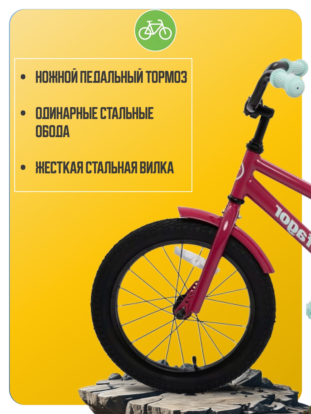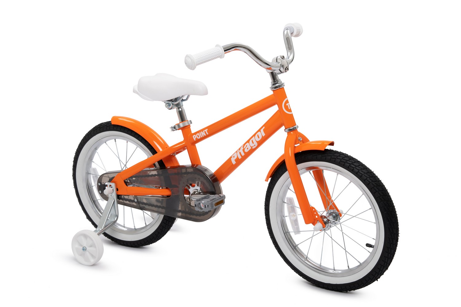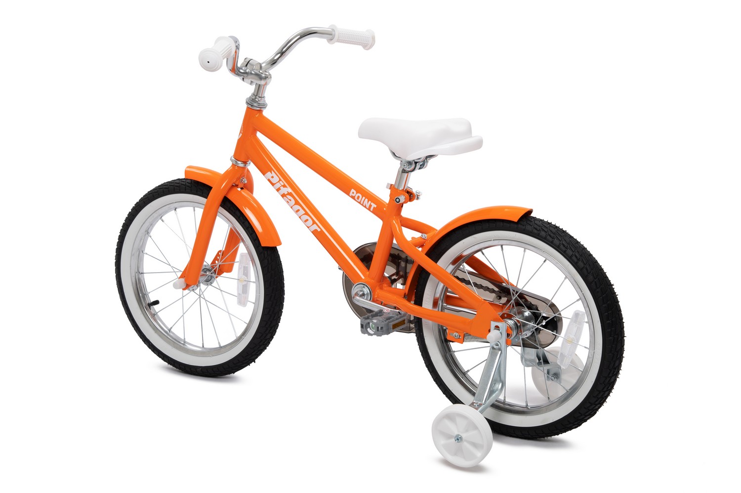 Велосипед, предназначенный для детей в возрасте от трех до шести лет, без переключения передач. Технические особенности: прочная стальная рама, жесткая стальная вилка, одинарные стальные обода, ножной педальный тормоз, съемные боковые колеса, полная защита цепи, крылья, звонок, насос, ключи для сборки велосипеда, набор стикеров. Подходит для обучения и прогулочного катания в городских условиях. Диаметр колес - 16 дюймов. Вес - 9,1 кг.
