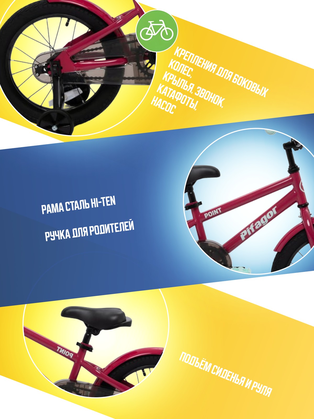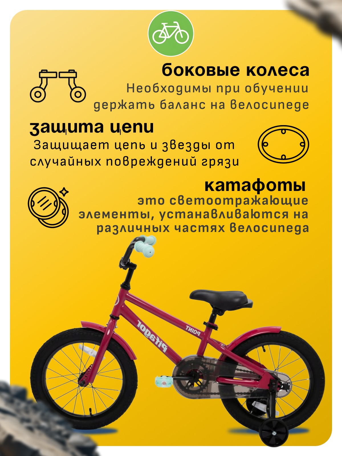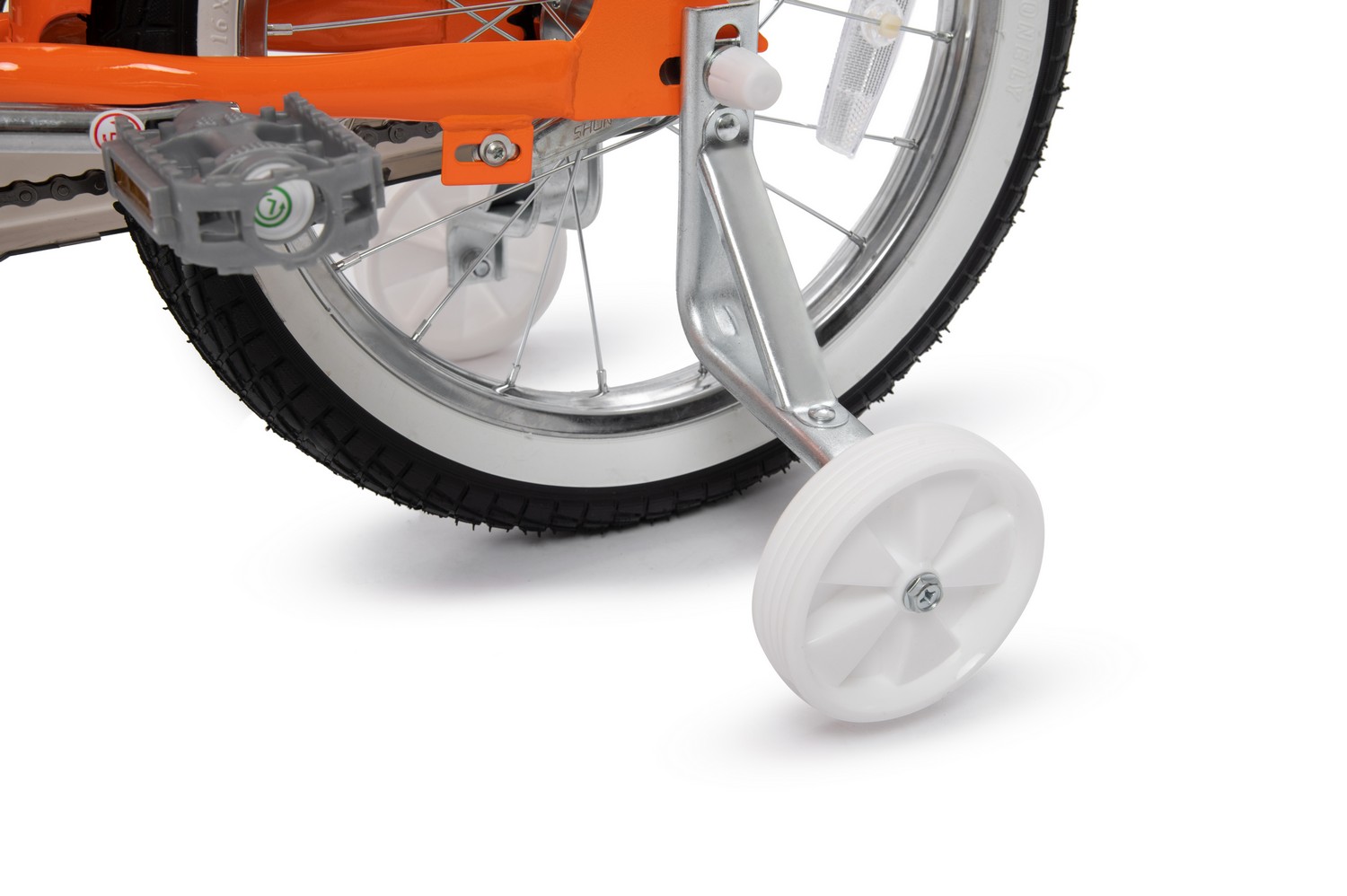 Особенности велосипеда: Боковые колеса, Защита цепи, Звонок, Катафоты, Крепления для боковых колес, Крылья, Насос, Ножной тормоз, Ручка для родителей.