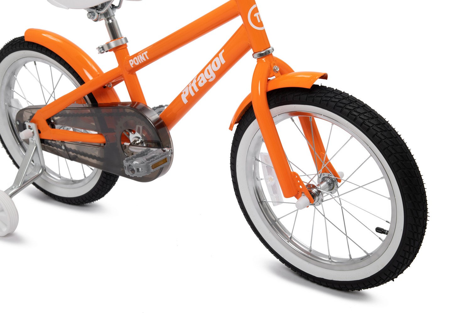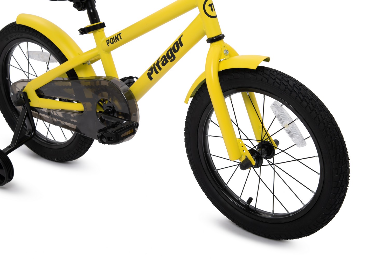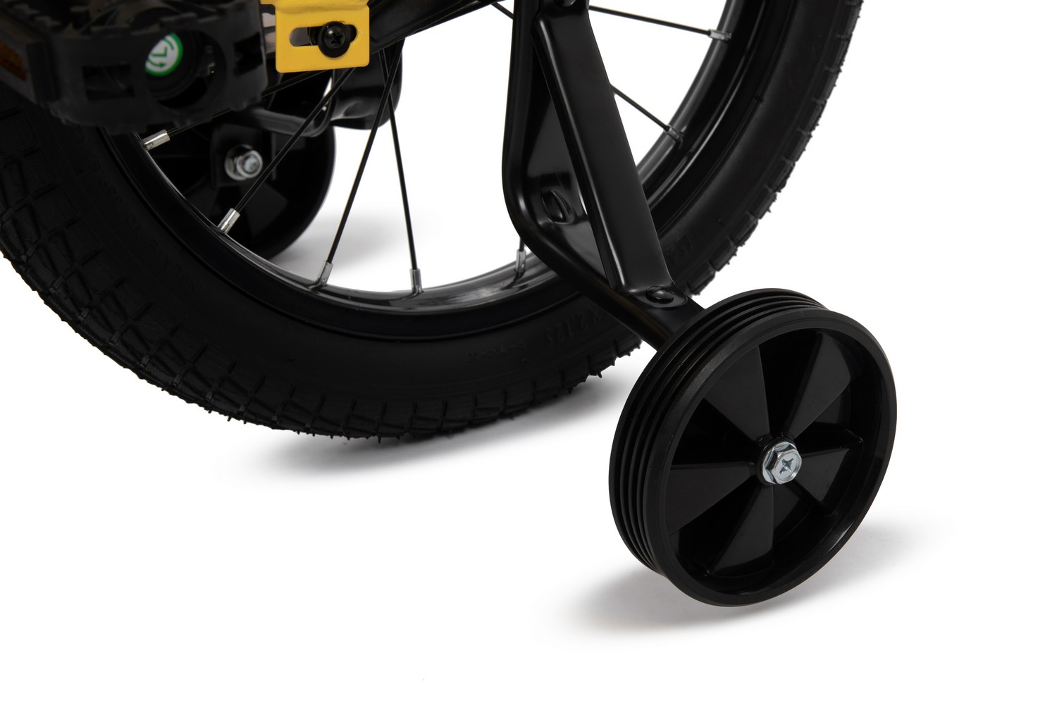 Особенности велосипеда: Боковые колеса, Защита цепи, Звонок, Катафоты, Крепления для боковых колес, Крылья, Насос, Ножной тормоз, Ручка для родителей.