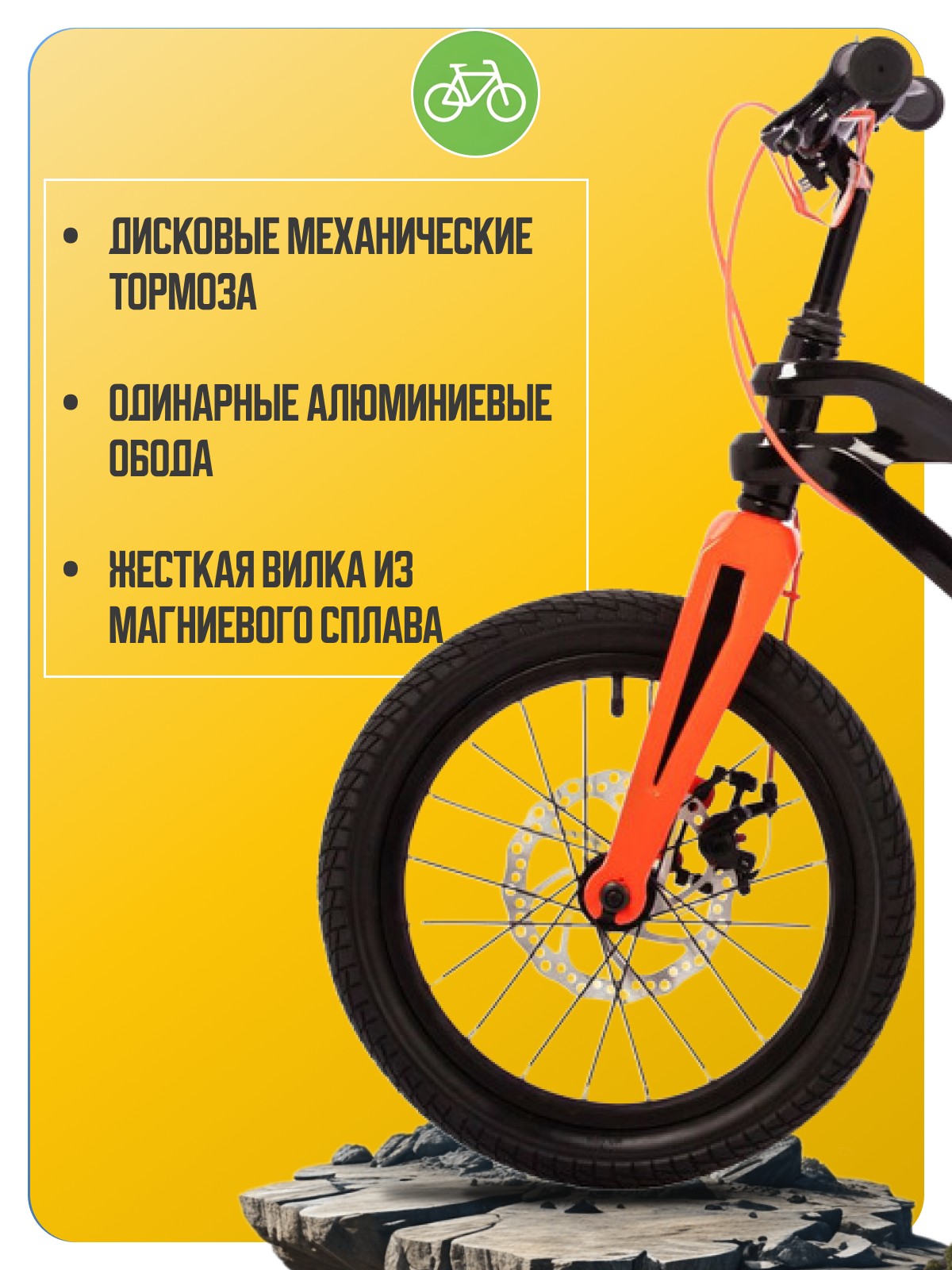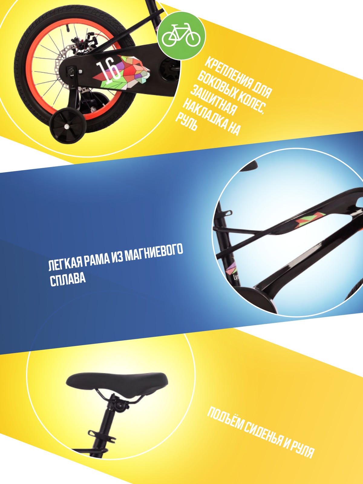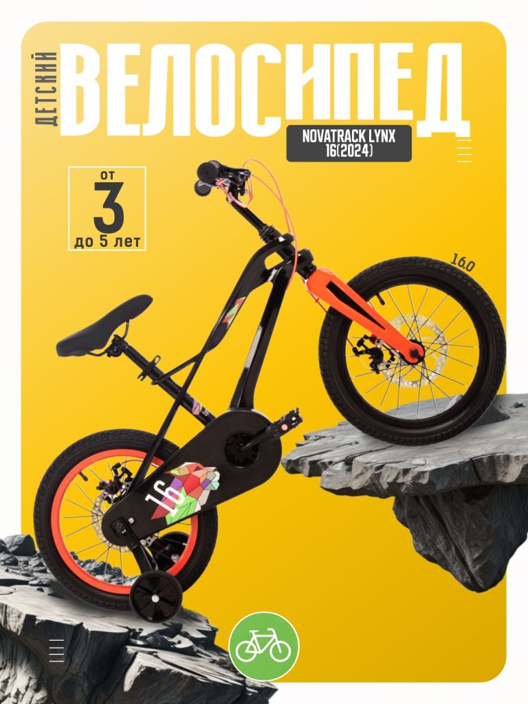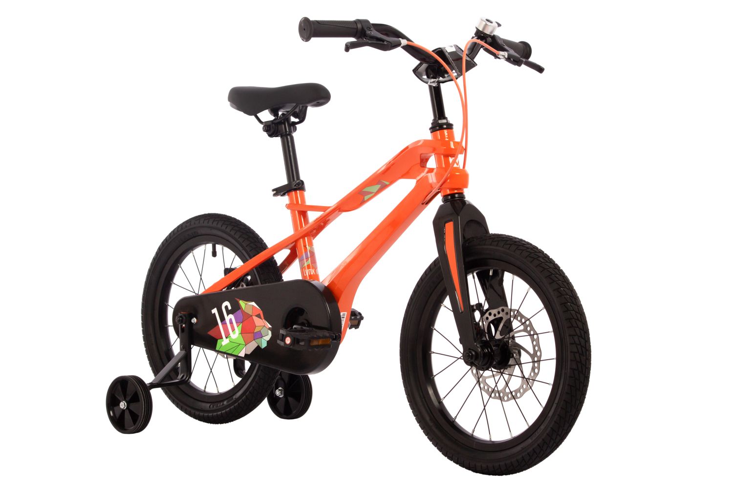 Велосипед, предназначенный для детей в возрасте от трех до шести лет, без переключения передач. Технические особенности: легкая рама из магниевого сплава, жесткая вилка из магниевого сплава, одинарные алюминиевые обода, дисковые механические тормоза (роторы 160/140 мм, 6 болтов), полная защита цепи, съемные боковые колеса, звонок. Подходит для обучения и прогулочного катания в городских условиях. Диаметр колес - 16 дюймов. Вес - 9,3 кг.