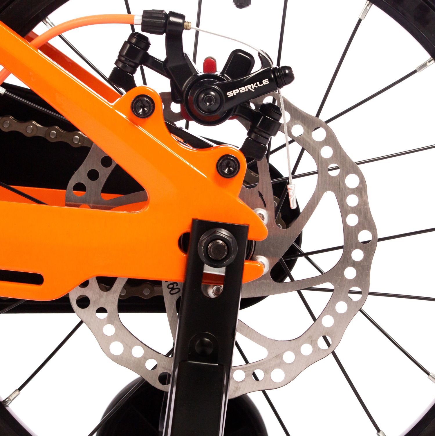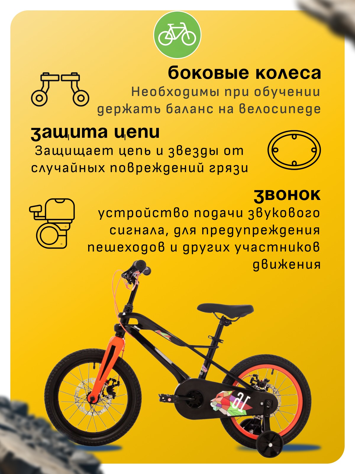 Особенности велосипеда: Боковые колеса, Дисковые тормоза, Защита цепи, Защитная накладка на руль, Звонок, Крепления для боковых колес.