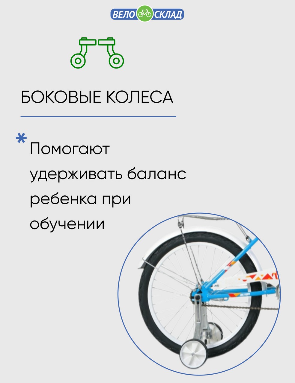 Особенности велосипеда: Багажник, Боковые колеса, Защита цепи, Защитная накладка на руль, Звонок, Катафоты, Крепления для боковых колес, Крылья, Мягкая накладка на руль, Ножной тормоз.