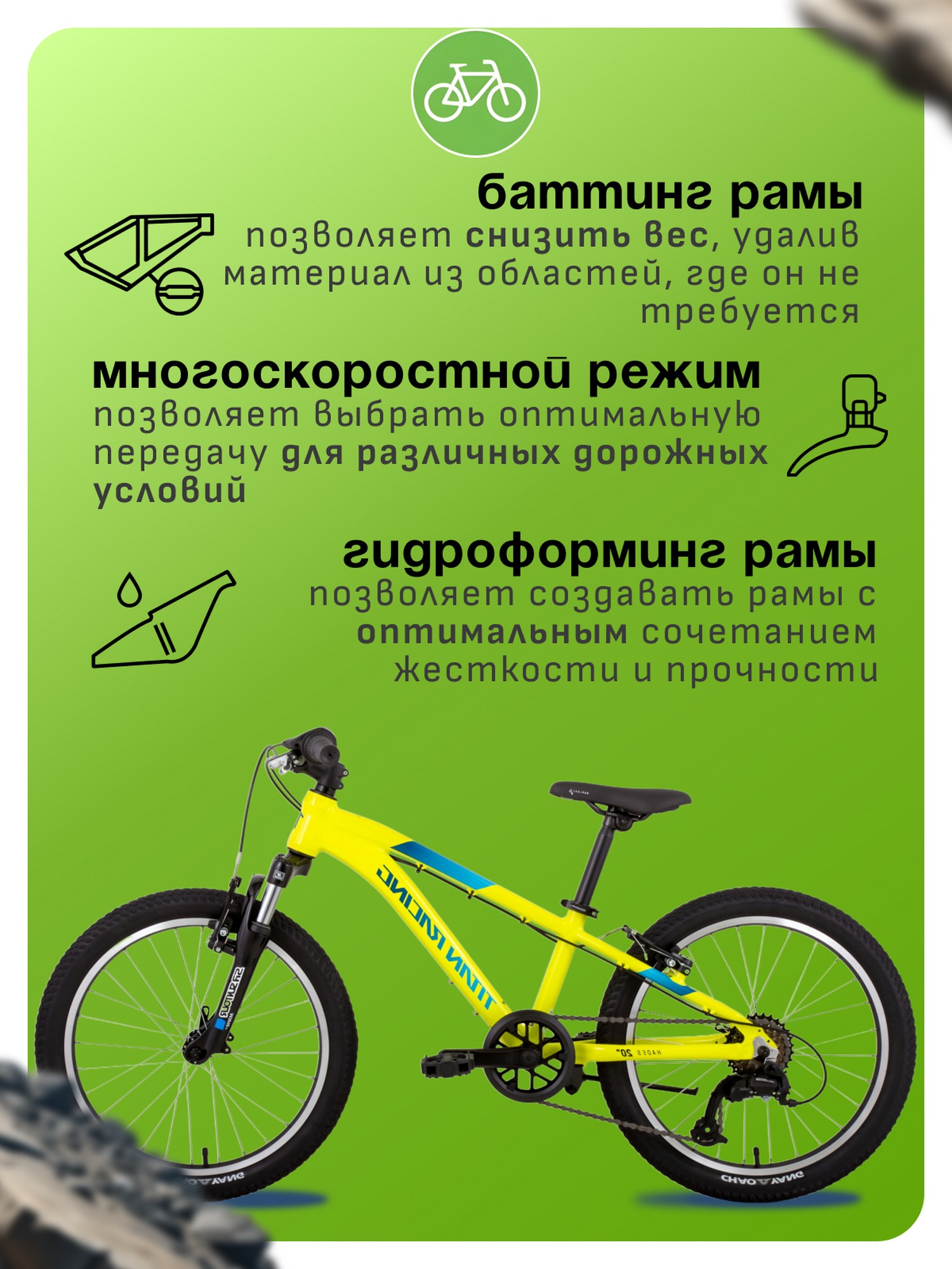 Особенности велосипеда: Алюминиевая рама, Амортизационная вилка, Баттинг рамы, Гидроформинг рамы, Защита цепи, Многоскоростной, Подножка.