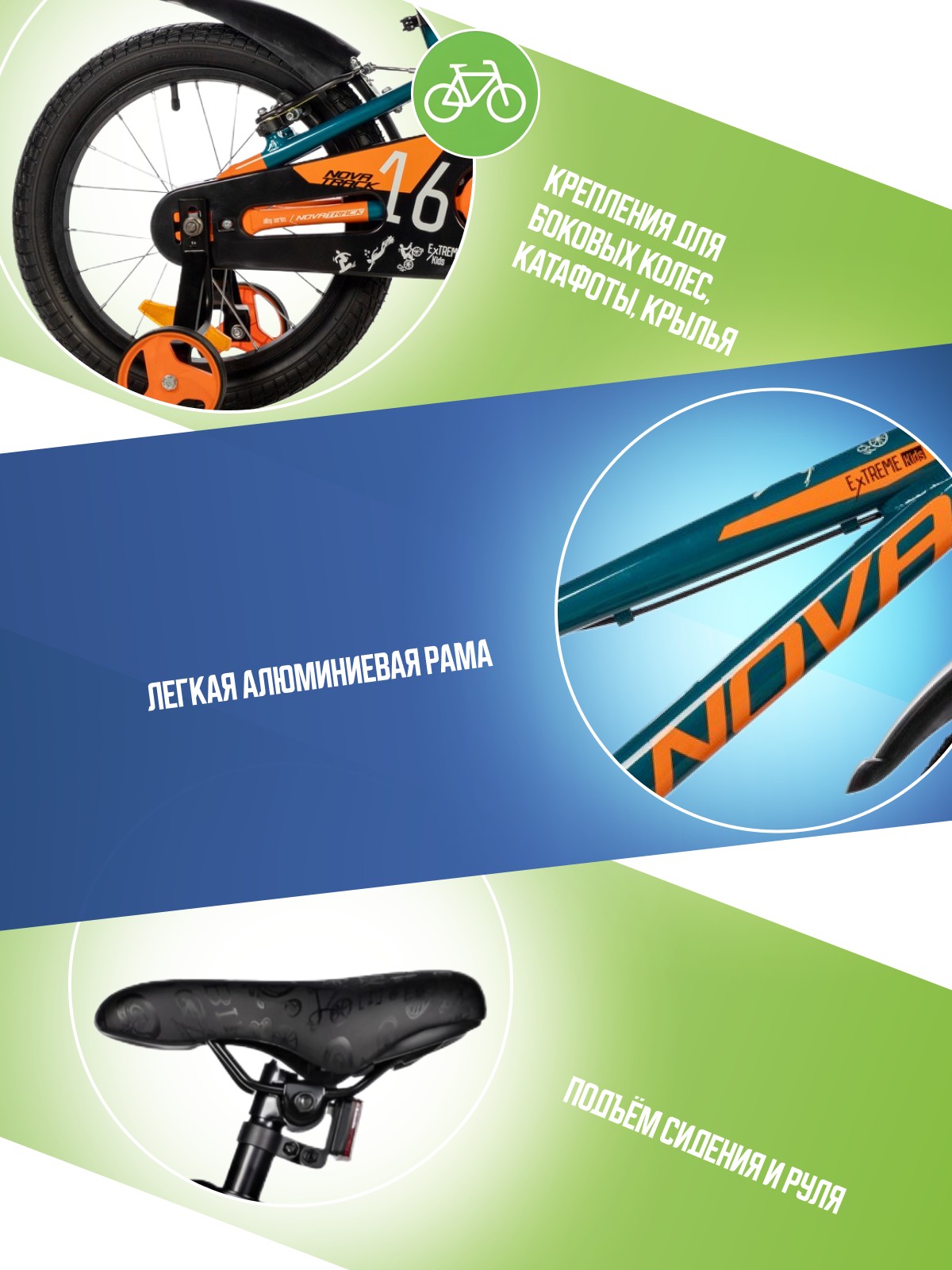 Алюминиевая рама, Боковые колеса, Защита цепи, Звонок, Катафоты, Крепления для боковых колес, Крылья