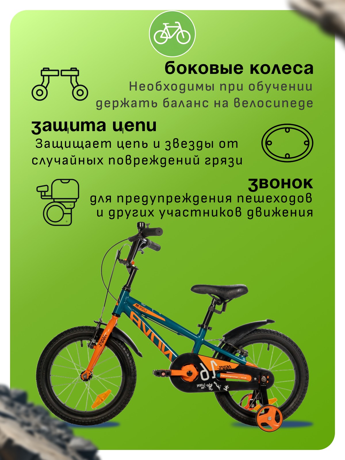 Особенности велосипеда: Алюминиевая рама, Боковые колеса, Защита цепи, Звонок, Катафоты, Крепления для боковых колес, Крылья.