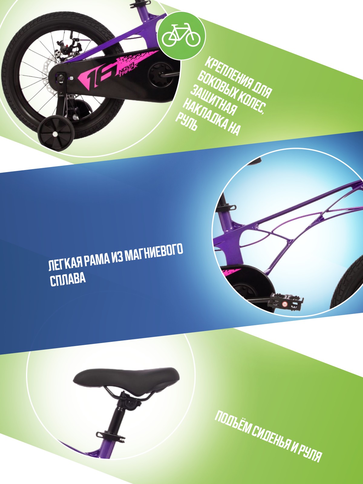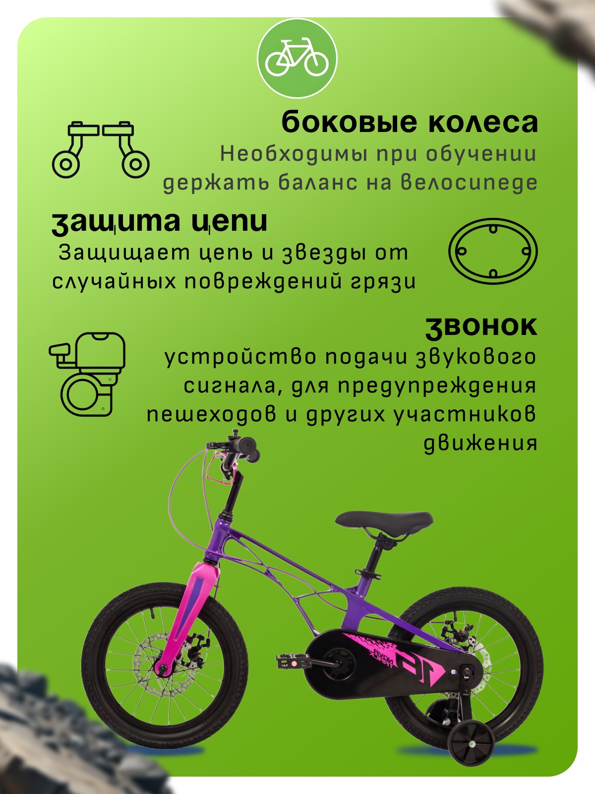 Особенности велосипеда: Боковые колеса, Дисковые тормоза, Защита цепи, Защитная накладка на руль, Звонок, Крепления для боковых колес.