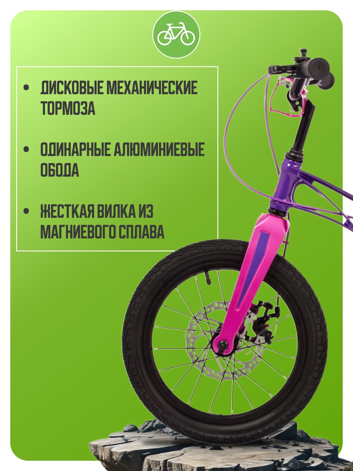 Велосипед, предназначенный для детей в возрасте от трех до шести лет, без переключения передач. Технические особенности: легкая рама из магниевого сплава, жесткая вилка из магниевого сплава, одинарные алюминиевые обода, дисковые механические тормоза STG (роторы 140/140 мм), полная защита цепи, съемные боковые колеса, защитная накладка на руле, звонок. Подходит для обучения и прогулочного катания в городских условиях. Диаметр колес - 16 дюймов. Вес - 9,3 кг.