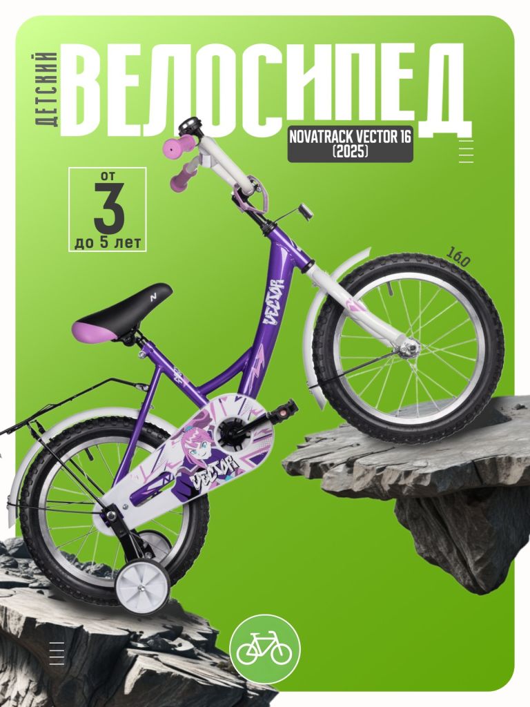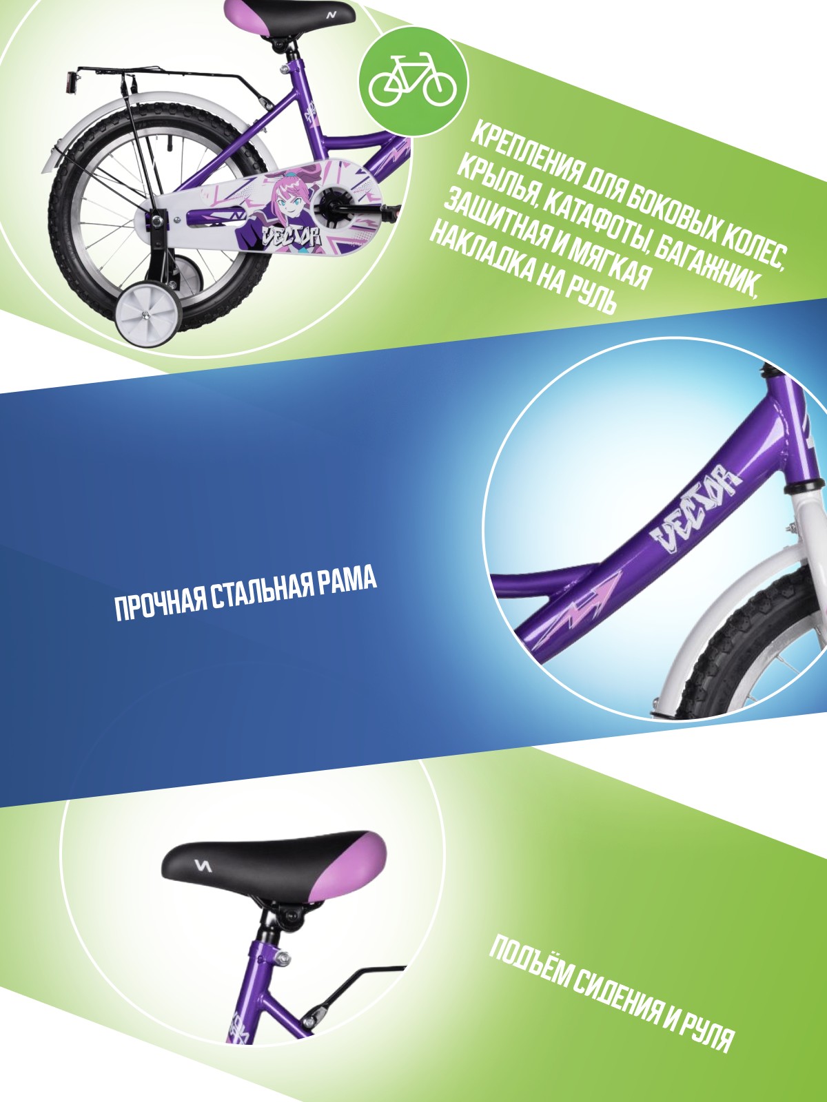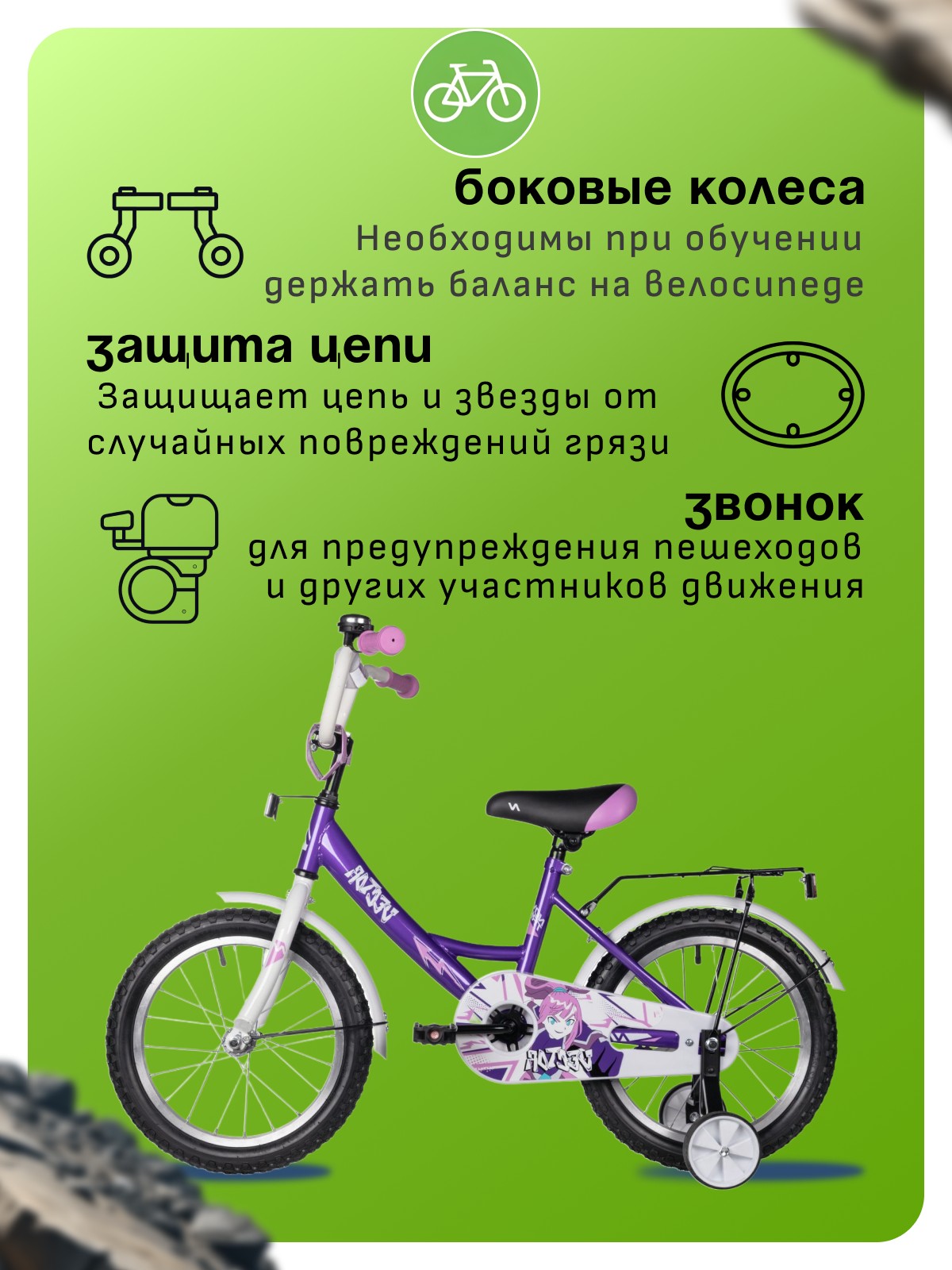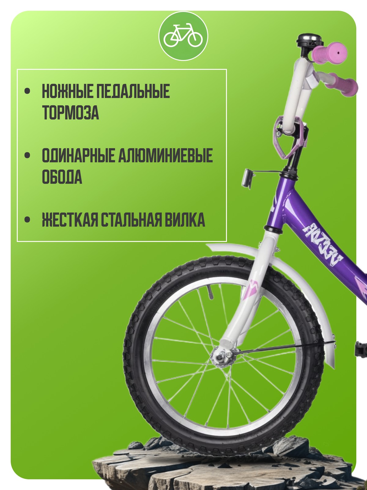 Велосипед, предназначенный для детей в возрасте от трех до шести лет, без переключения передач. Технические особенности: прочная стальная рама (Hi-Ten, кареточный стакан BSA, выносные чашки рулевой колонки), жесткая стальная вилка (дропауты 10 мм), одинарные алюминиевые обода (под ниппель AV), ножные педальные тормоза, полная защита цепи, съемные боковые колеса, длинные крылья, задний багажник, мягкая накладка на руле, катафоты, звонок. Подходит для обучения и прогулочного катания в городских условиях. Диаметр колес - 16 дюймов. Вес - 10,1 кг.