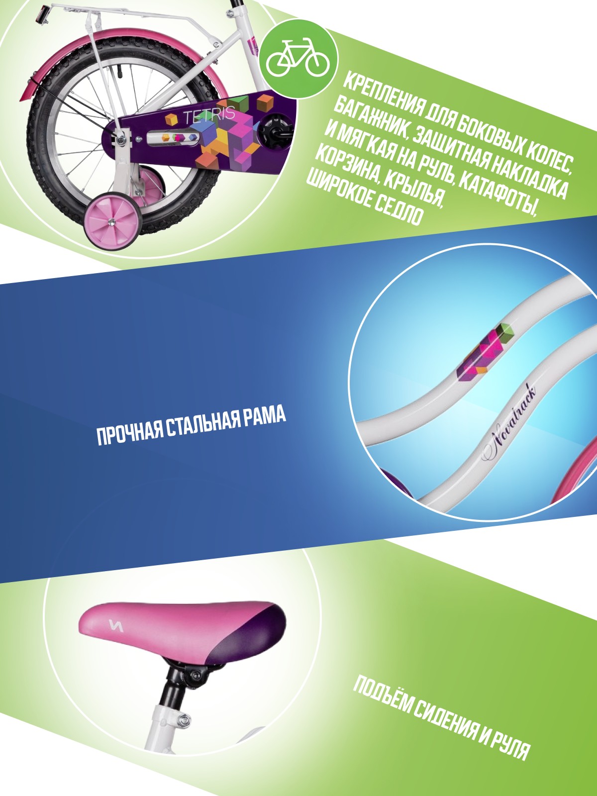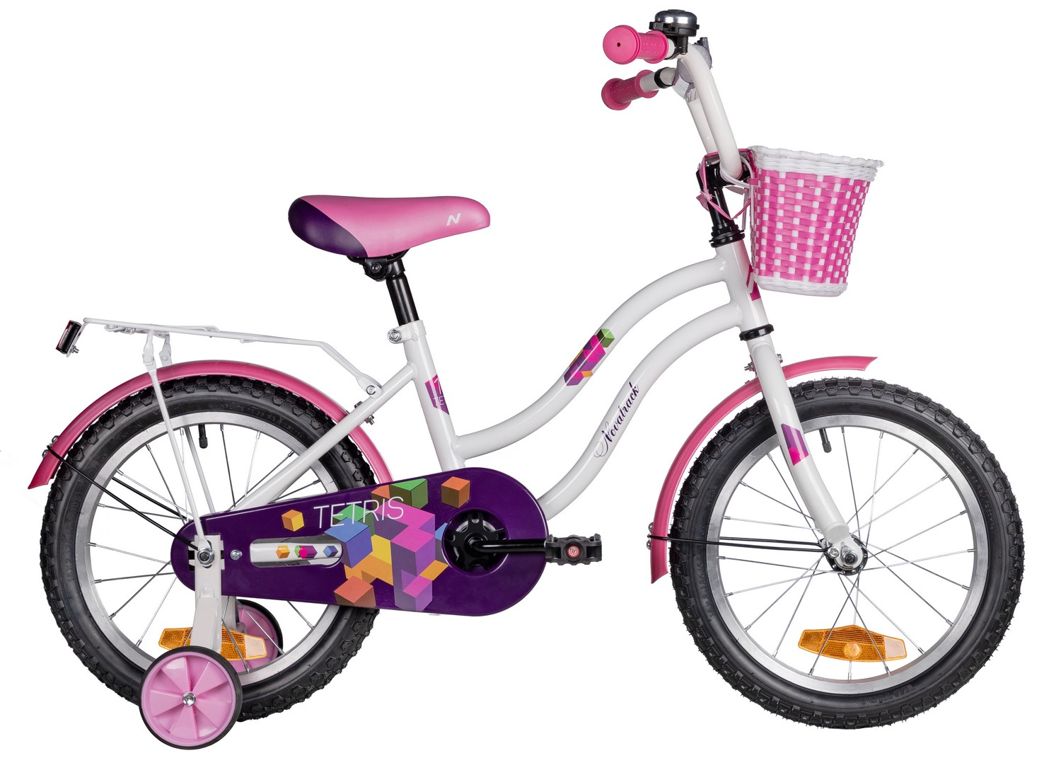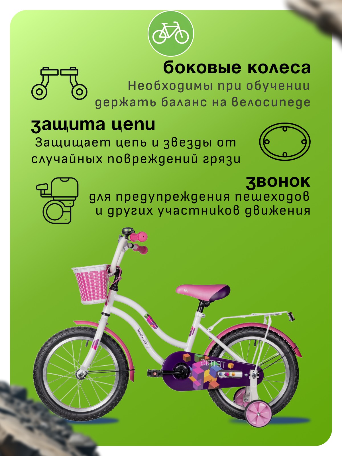 Особенности велосипеда: Багажник, Боковые колеса, Защита цепи, Защитная накладка на руль, Звонок, Катафоты, Корзина, Крепления для боковых колес, Крылья, Мягкая накладка на руль, Ножной тормоз, Широкое седло.
