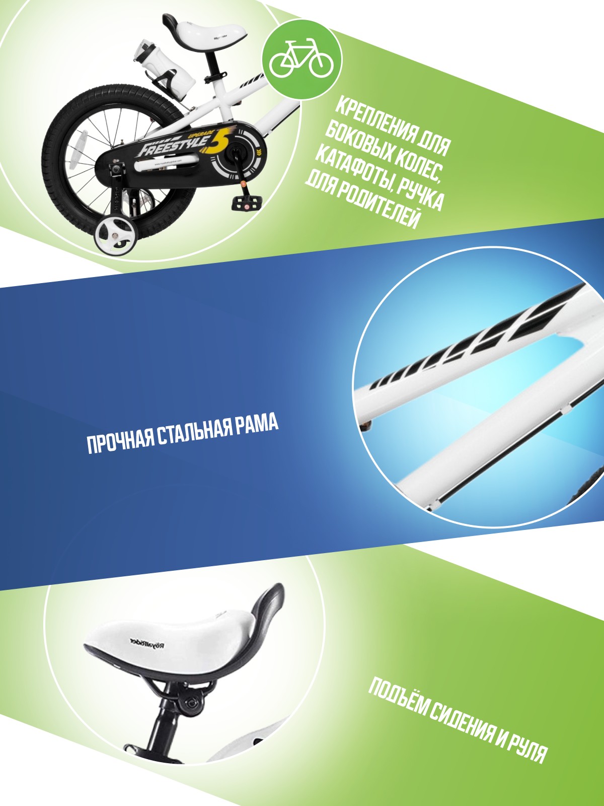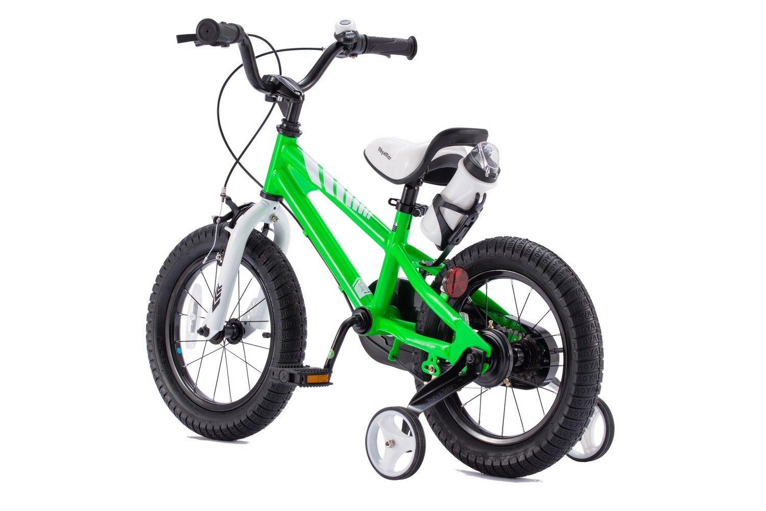 Особенности велосипеда: Боковые колеса, Защита цепи, Звонок, Крепления для боковых колес, Ручка для родителей, Катафоты.