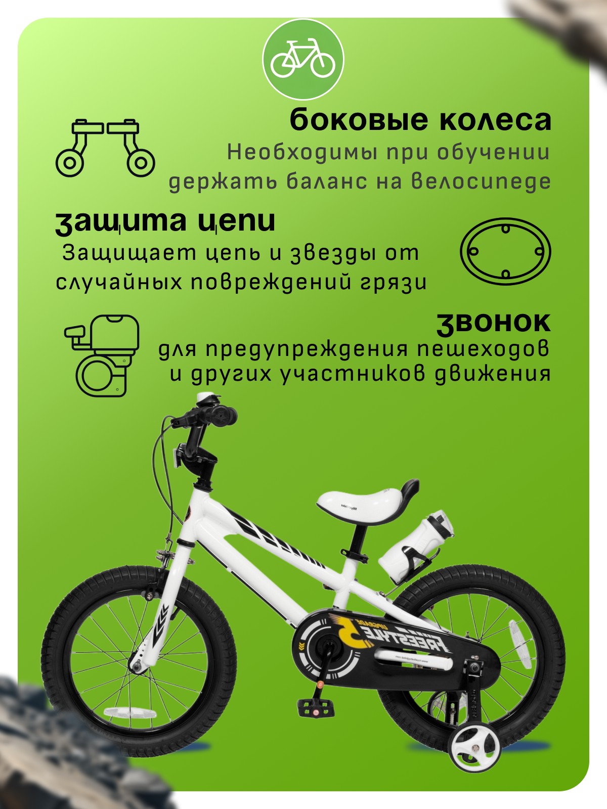 Боковые колеса, Защита цепи, Звонок, Крепления для боковых колес, Ручка для родителей, Катафоты