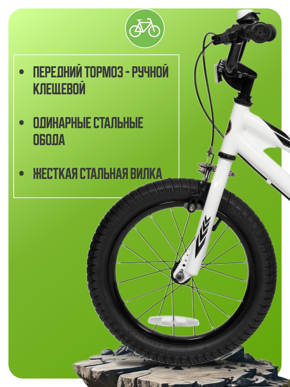Велосипед, предназначенный для детей в возрасте от трех до шести лет, без переключения передач. Технические особенности: прочная стальная рама (открытая прокладка троса, прямой дропаут, не интегрированная рулевая колонка, каретка BSA), жесткая стальная вилка (дропауты 10 мм), одинарные стальные обода, передний тормоз - ручной клещевой, задний тормоз - барабанный, полная защита цепи, съемные боковые колеса, поддерживающая ручка, бутылочка для воды с держателем, звонок, катафоты. Подходит для обучения и прогулочного катания в городских условиях. Диаметр колес - 16 дюймов. Вес - 11 кг.