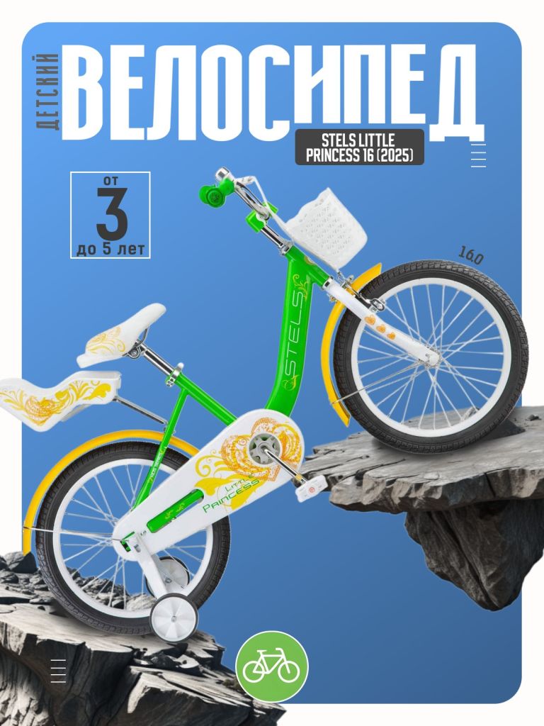 Велосипед, предназначенный для девочек в возрасте от трех до шести лет, без переключения передач. Технические особенности: прочная стальная рама, жесткая стальная вилка, одинарные стальные обода (под AV ниппель), передний тормоз - ручной, задний тормоз - ножной, полная защита цепи, длинные крылья, съемные боковые колеса, сиденье для куклы, передняя корзинка, звонок. Подходит для обучения и прогулочного катания в городских условиях. Диаметр колес - 16 дюймов. Вес - 10 кг.