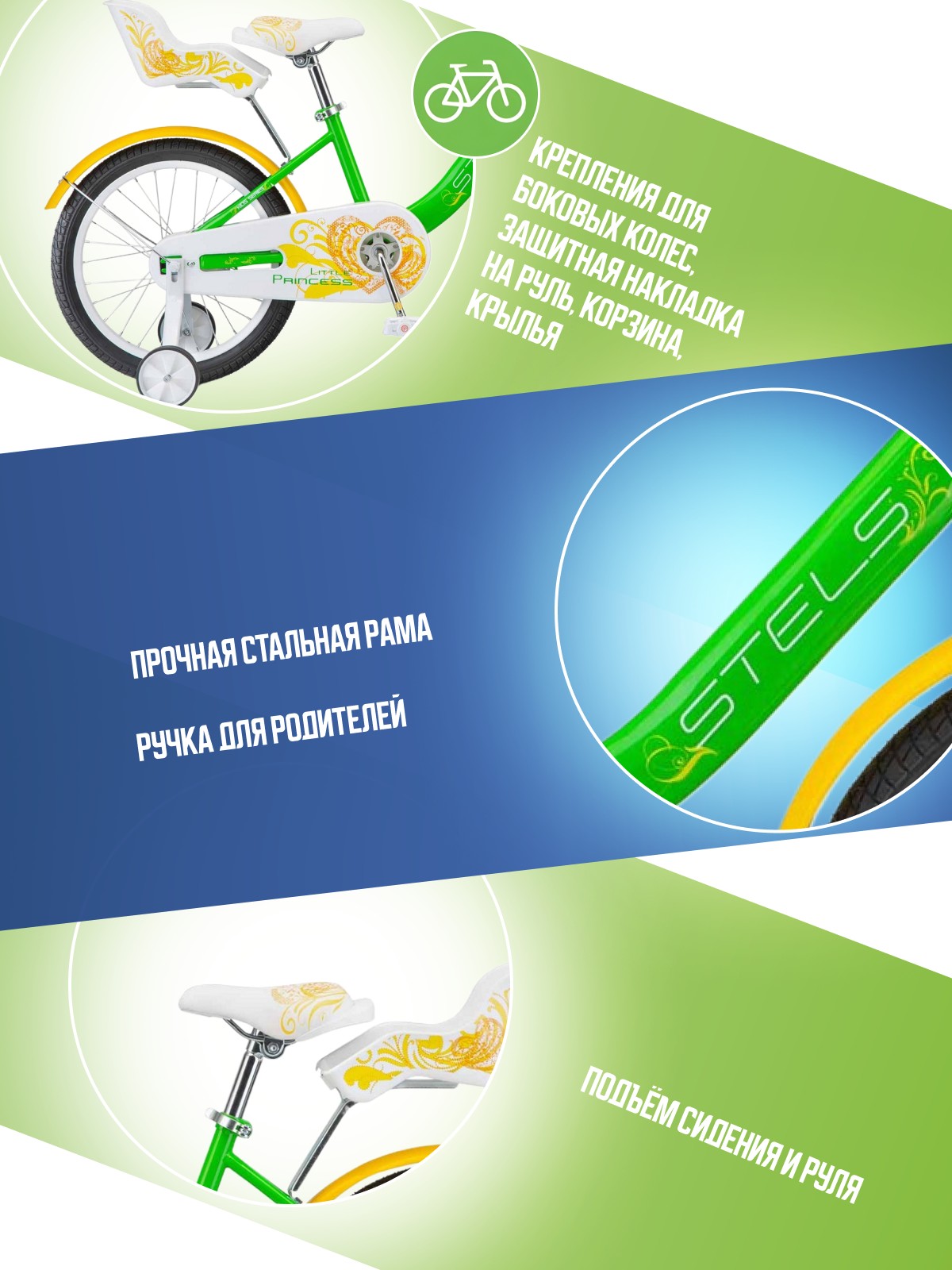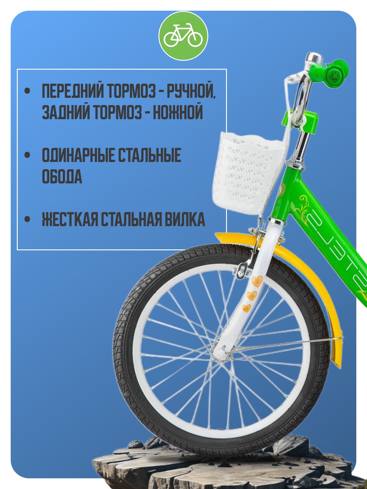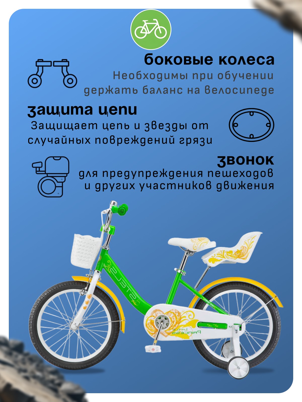 Особенности велосипеда: Боковые колеса, Защита цепи, Защитная накладка на руль, Звонок, Корзина, Крепления для боковых колес, Крылья, Ножной тормоз, Ручка для родителей.