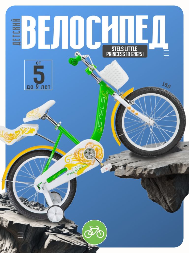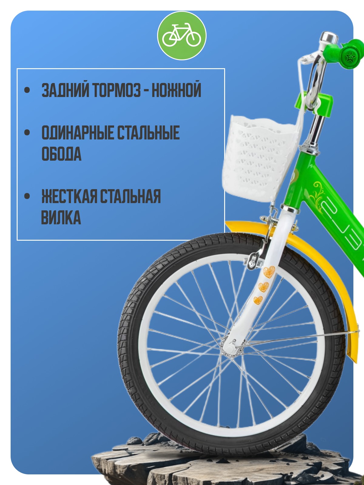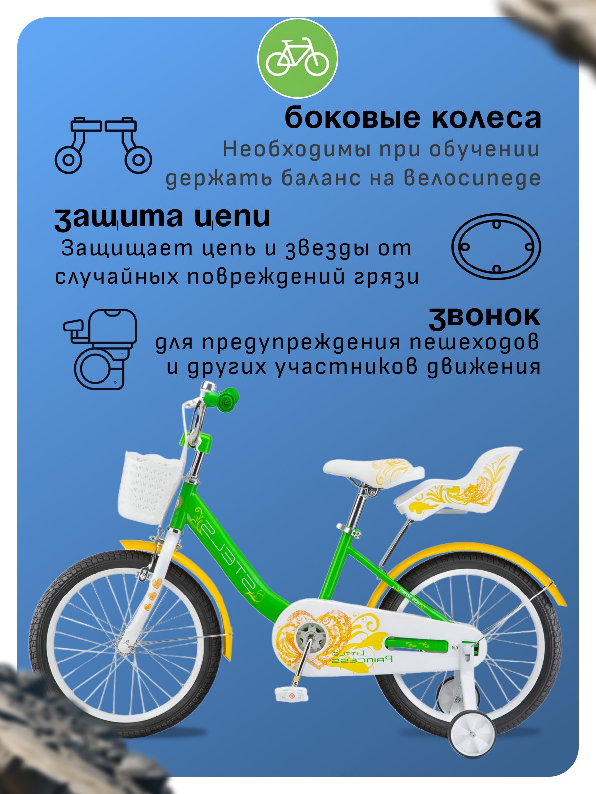 Велосипед, предназначенный для детей в возрасте от четырех до восьми лет, без переключения передач. Технические особенности: прочная стальная рама, жесткая стальная вилка, одинарные стальные обода (под AV ниппель), передний тормоз - ручной, задний тормоз - ножной, полная защита цепи, длинные крылья, съемные боковые колеса, сиденье для куклы, передняя корзинка, звонок. Подходит для обучения и прогулочного катания в городских условиях. Диаметр колес - 18 дюймов. Вес - 11 кг.