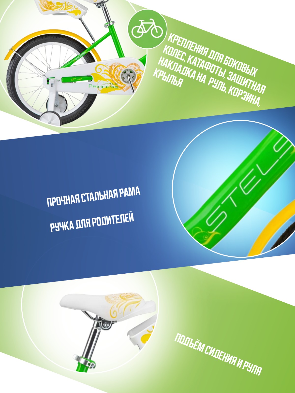 Особенности велосипеда: Боковые колеса, Защита цепи, Защитная накладка на руль, Звонок, Корзина, Крепления для боковых колес, Крылья, Ножной тормоз, Ручка для родителей.