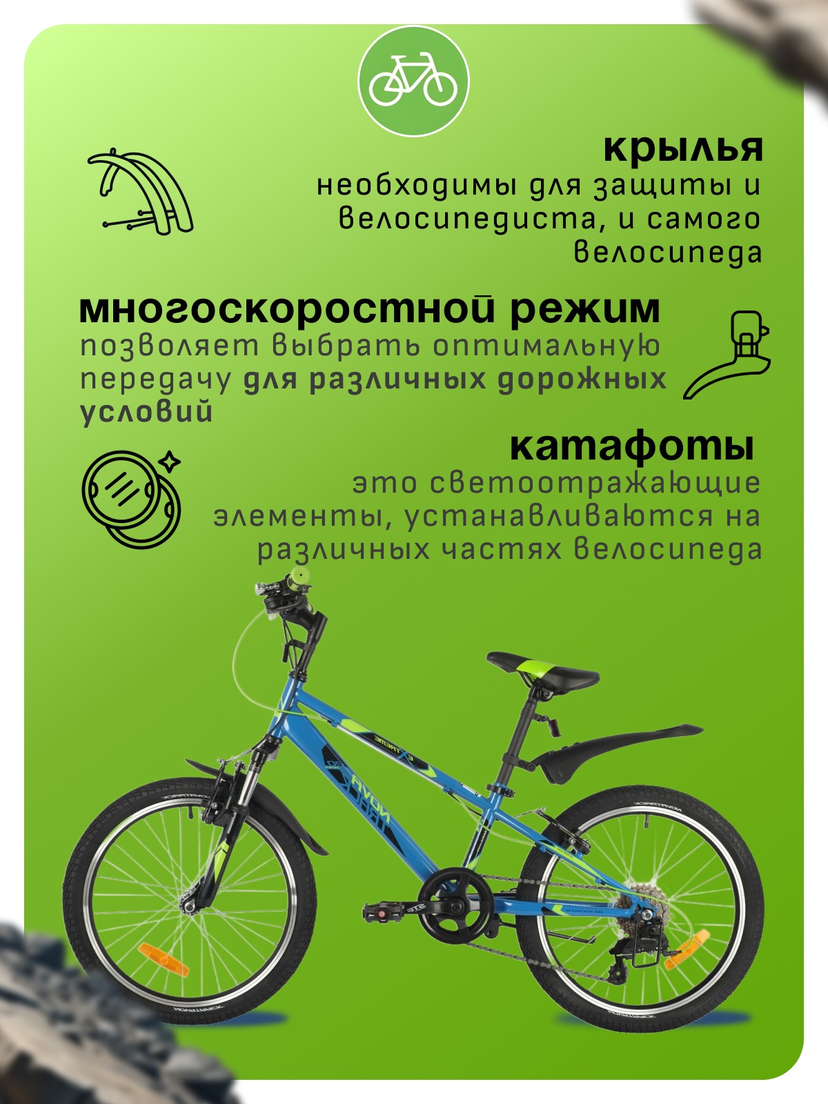 Амортизационная вилка, Двойные обода, Катафоты, Крылья, Многоскоростной, Подножка